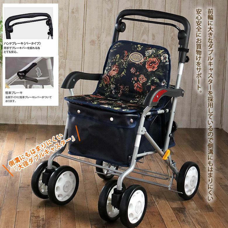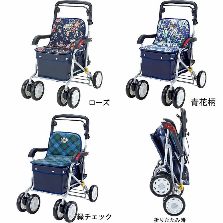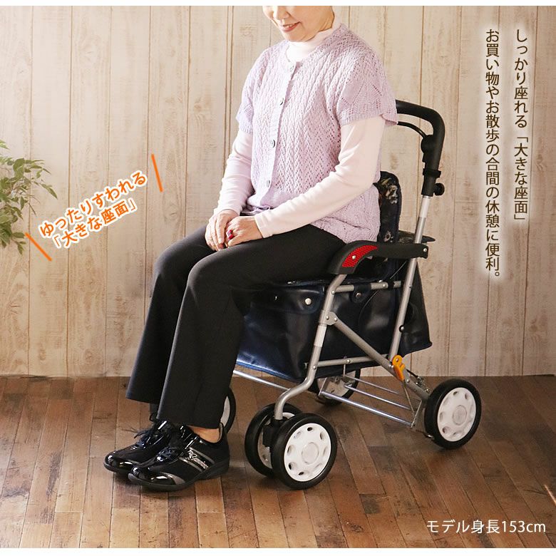 ○ゆったり座れるベーシックタイプ 幅の広いシートで広々とした快適な座り心地 あきのこないデザインと、幅の広いシートで広々。肘かけもついて快適な座り心地を実現しました。袋部は大容量なので大変便利です。 ○押手の高さ調節が可能! ○前輪はキャスター回転止め機能付き。 ○傘や杖などを止める、傘止めバンド付き。 ○手元ブレーキで安心設計!! ○コンパクトに折りたためて収納もスッキリ! ○耐荷重:100kg