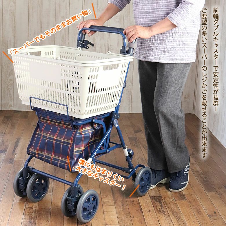 ●サイズ/幅48×奥行54×高さ82.5~90cm、折りたたみ時:幅48×奥行34×高さ66.5cm、座面:幅28×奥行19.5cm、座面高:47.5cm ●車輪サイズ/前輪15×後輪15cm ●重さ/5kg ●バッグ容量/約12L ●バッグ耐荷重/10kg ●材質/本体:アルミ(粉体塗装)、シート:(格子NB)ポリエステル、(花柄BR)ビニールレザー、タイヤ:EVA ●最大使用者体重/80kg ●標準機能/折りたたみ式、ハンドル高さ調整(3段階/3.5cmピッチ)