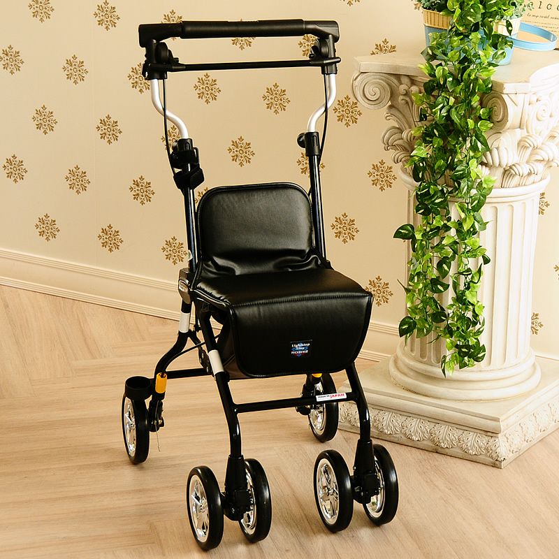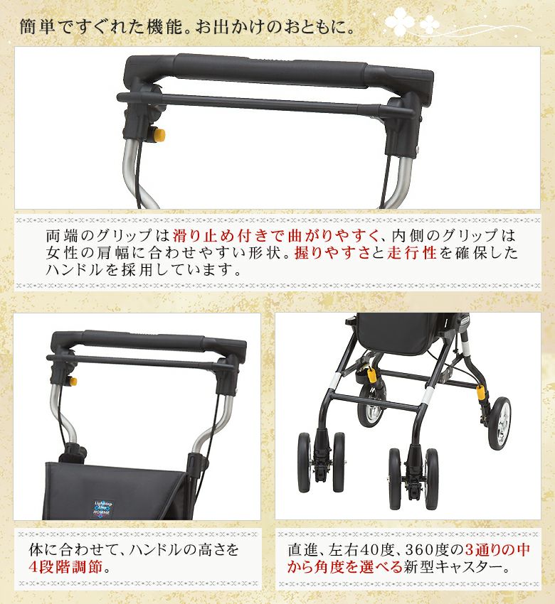 ハイエンドシルバーカーコンパクトタイプのメンズターゲットモデルで、ヌーボーより3cmハンドル高さが高く、4kgの軽量、黒を基調にしながらメッキ車輪で仕上げております。傷のつきにくいフレーム採用し、手元ブレーキ、ボタン式ストッパー、前後にバッグ搭載で、使い易いです。 ●象印初の男性用シルバーカー登場 ●ホイールにメッキ塗装を使用 ●デラックスカーブハンドルで、外側は、滑り止め、内側は、クッション採用 ●女性の方にも使っていただけます ●キズのつきにくい特殊アルマイトを使用 完成サイズ:幅42×奥行56×高さ86・89・92・95(cm) 収納サイズ:幅42×奥行30×高さ93(cm) 座面サイズ:幅27cm×奥行23cm 高さ44cm 積載重量:前袋2kg(幅19×奥行8×高さ26cm 4.0L)、後袋1kg(幅18×奥行4×高さ23cm 1.6L) 重量:4kg 車輪サイズ:14.5(cm)