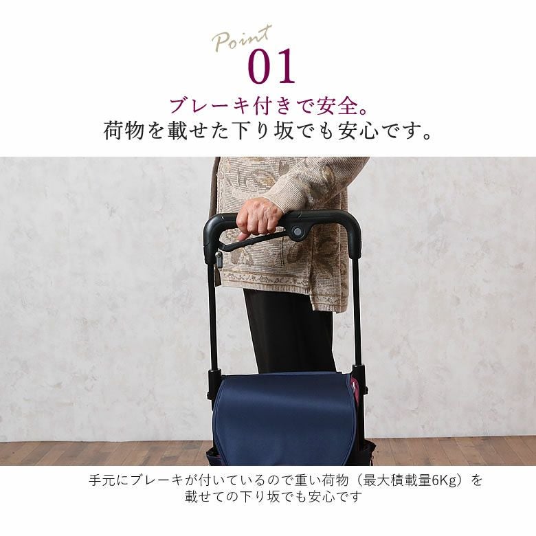 ・手元にブレーキが付いているので重い荷物(最大積載量6Kg)を載せての下り坂でも安心です