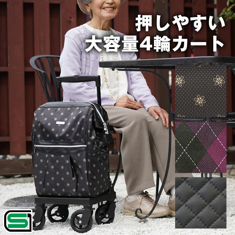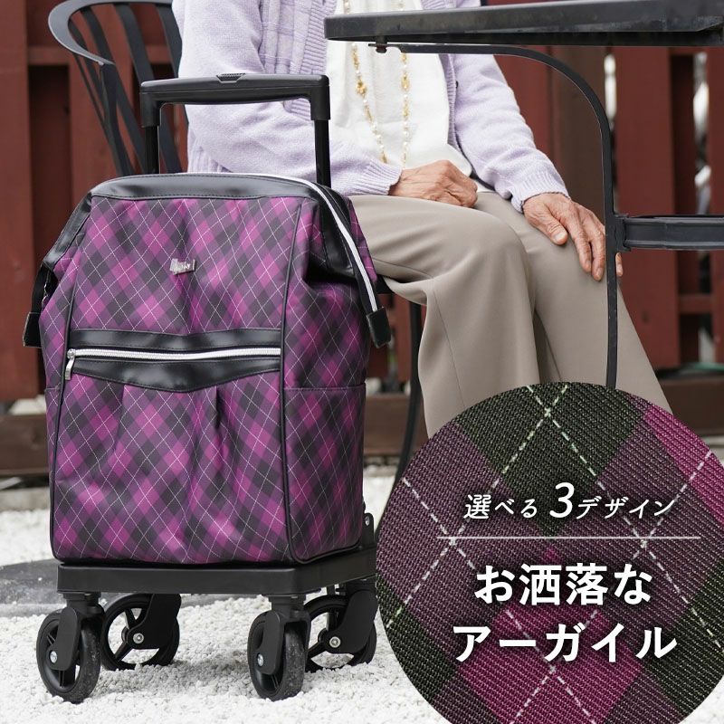 ●サイズ/幅23.5×奥行37×高さ68~84(5段階/4cm)cm、折りたたみ時:幅23.5×奥行37×高さ59cm ●車輪サイズ/前輪10×後輪10cm ●重さ/2.5kg ●材質/フレーム:アルミ、バッグ:表地:(アーガイル・花柄ドットショコラ)ポリエステル・(キルティングBK)ナイロン、裏地:ナイロン ●バッグ容量/15L ●積載荷重/8kg ●標準機能/1WAYキャスター(360°)、駐車ブレーキ、杖・傘立て、保冷 ●生産国/ベトナム