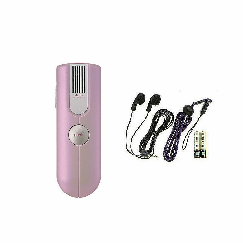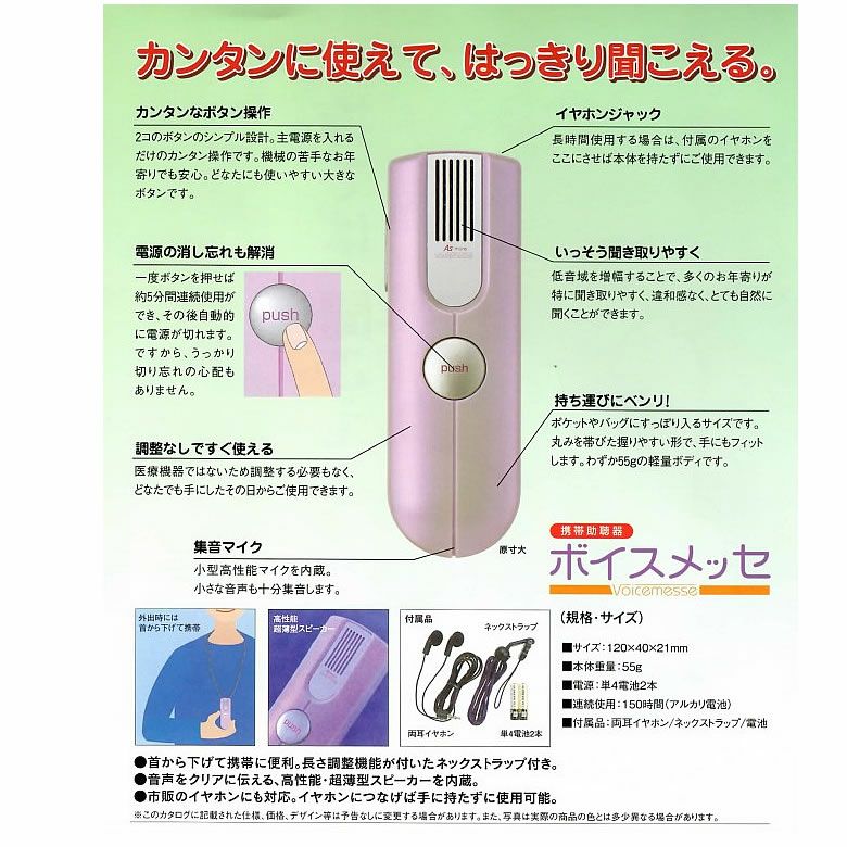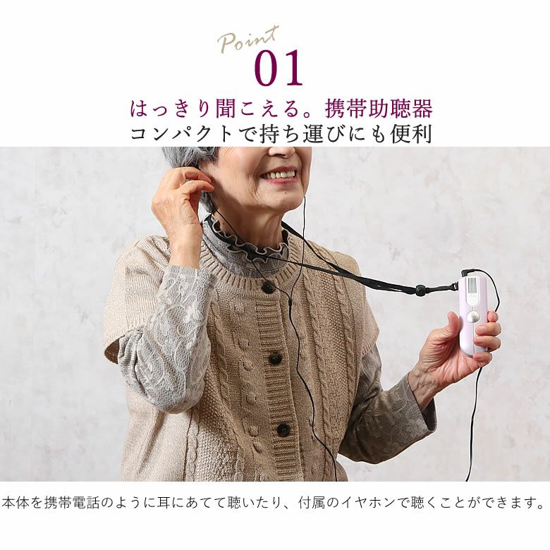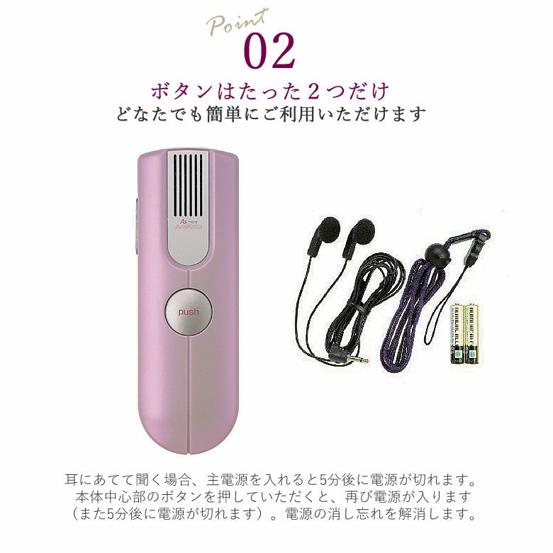 ○耳にあてて聴く 裸耳で聴く ○本体を携帯電話のように耳にあてて聴いたり、付属のイヤホンで聴くことができます。耳にあてて聞く場合、主電源を入れると5分後に電源が切れます。本体中心部のボタンを押していただくと、再び電源が入ります(また5分後に電源が切れます)。電源の消し忘れを解消します。 ○できるだけマイク(本体の下)を音源(話者)に近づけてください。 ○電源:単4電池2本(150時間)