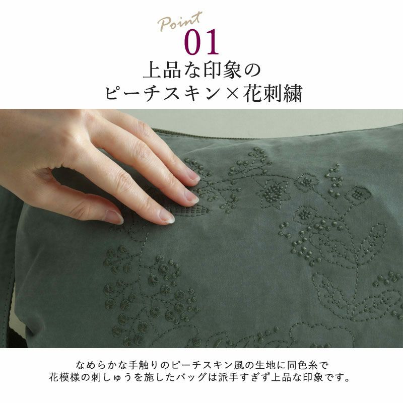 なめらかな手触りのピーチスキン風の生地に同色糸で花模様の刺しゅうを施した、ショルダーバッグ。体に沿うちょうどいい大きさ・軽さで、ファスナーでしっかりと閉められるので旅行にもおすすめです。