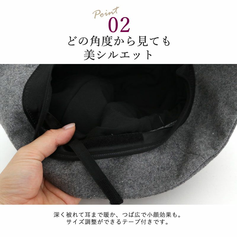 ちょっとしたお出掛けや髪を整える時間がない時でも、すっぽりかぶるだけで簡単オシャレに見えるキャスケット帽子。ウール混の素材で深く被れて、耳まで暖かです。どの角度から見ても美シルエットで、つば広で小顔効果も。サイズ調整ができるテープ付きです。