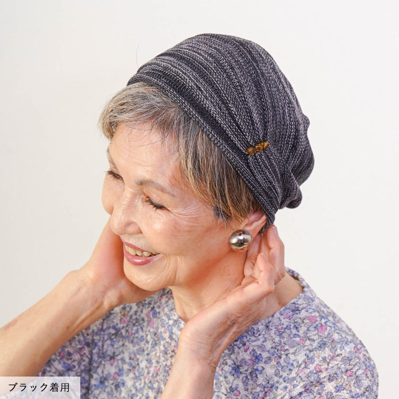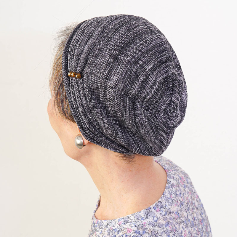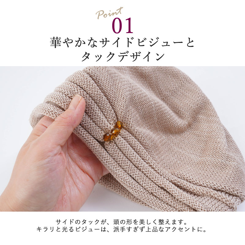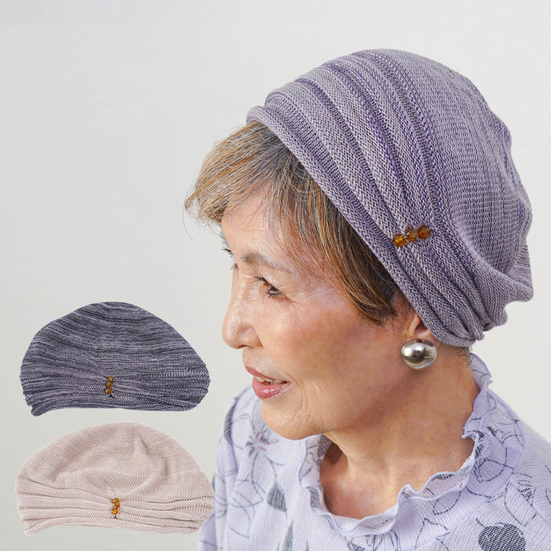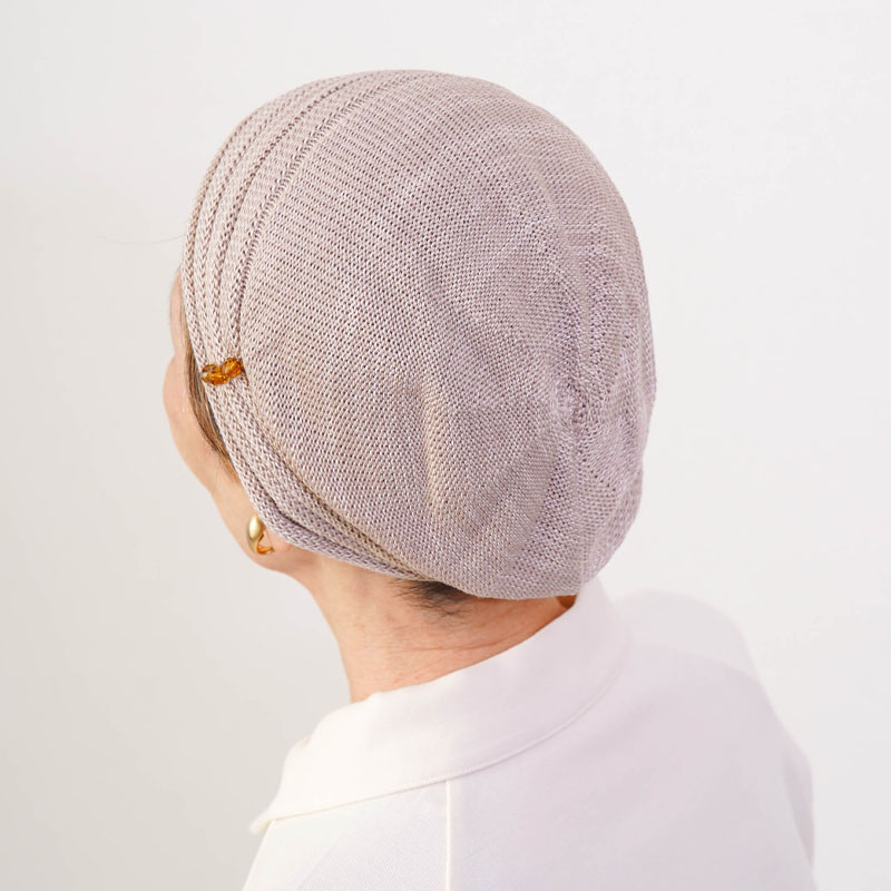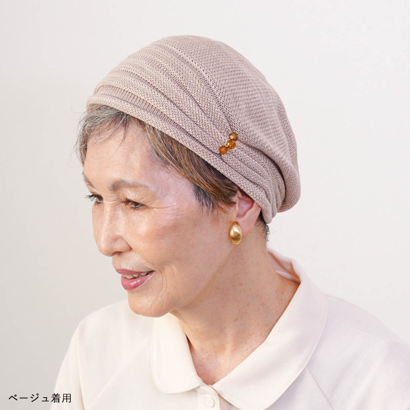 サイドに施されたタックデザインと、繊細なビジュー飾りがお顔周りを華やかに彩ります。杢調のミックスカラーが落ち着いた印象を与え、普段の装いをワンランク上の装いへと格上げ。室内だけでなく、お友達とのランチや通院、お散歩など、ちょっとしたお出かけにも最適なエレガントな帽子です。