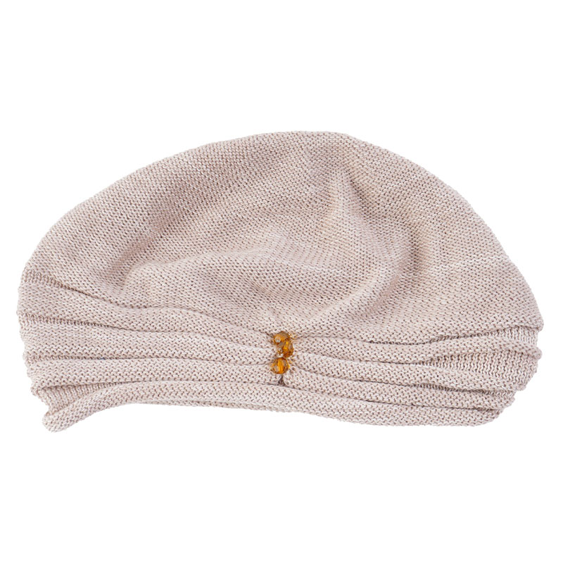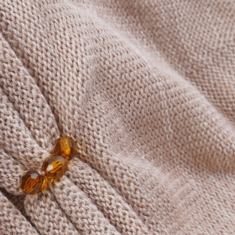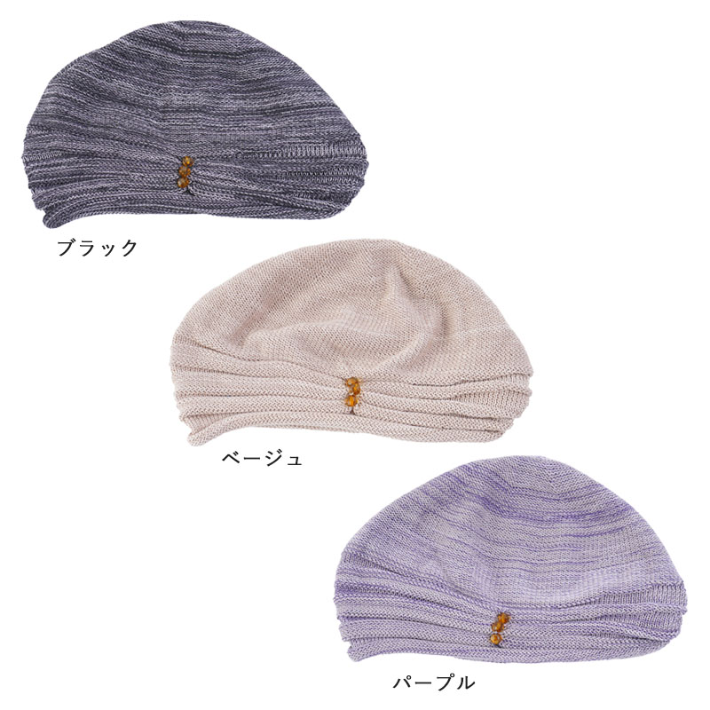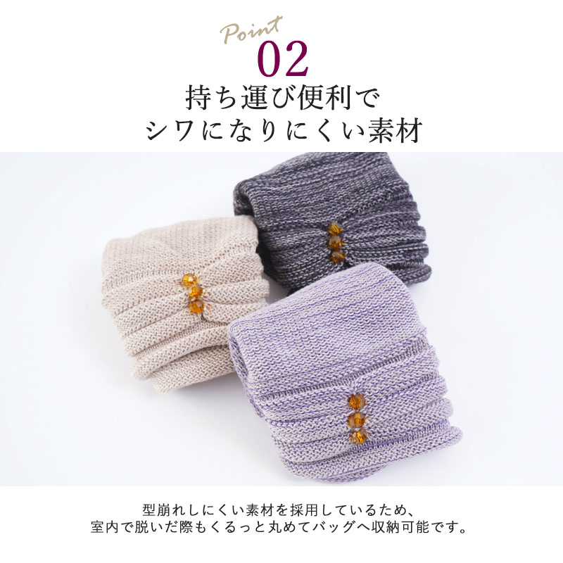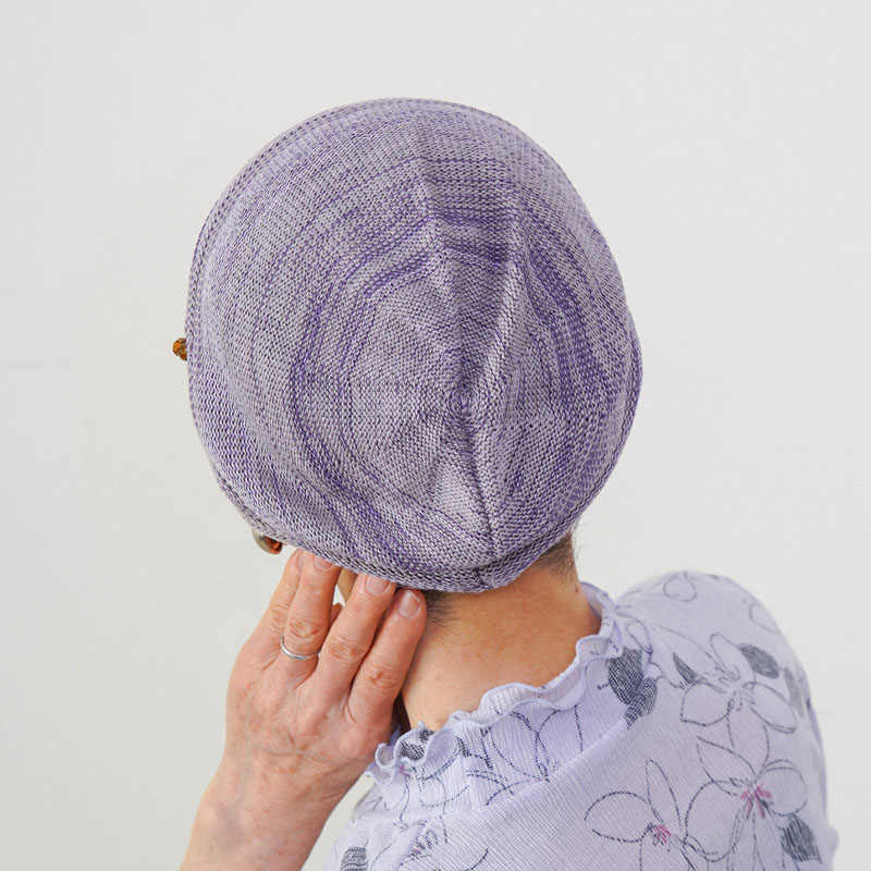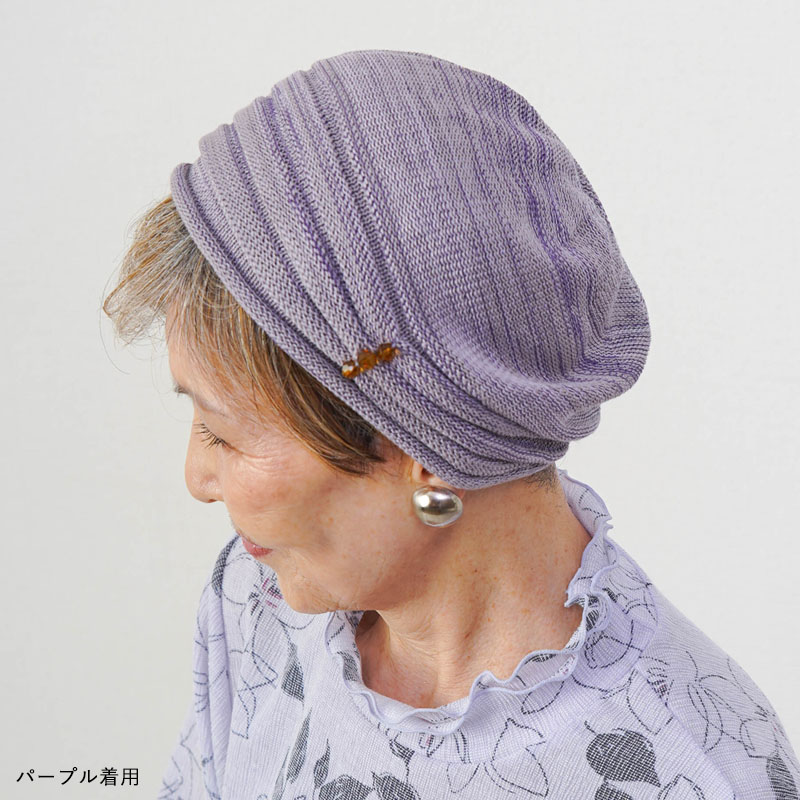 サイドに施されたタックデザインと、繊細なビジュー飾りがお顔周りを華やかに彩ります。杢調のミックスカラーが落ち着いた印象を与え、普段の装いをワンランク上の装いへと格上げ。室内だけでなく、お友達とのランチや通院、お散歩など、ちょっとしたお出かけにも最適なエレガントな帽子です。