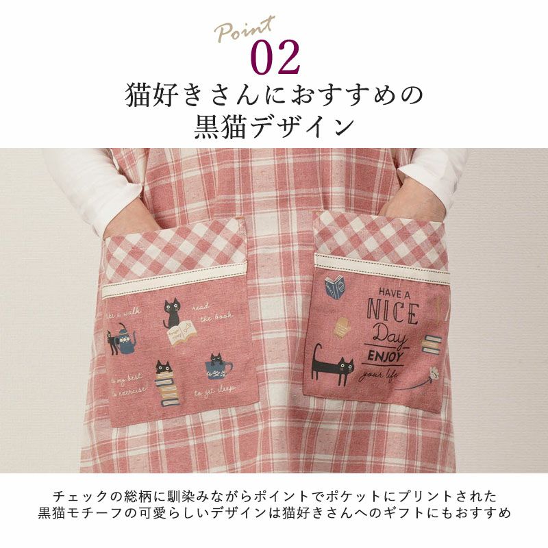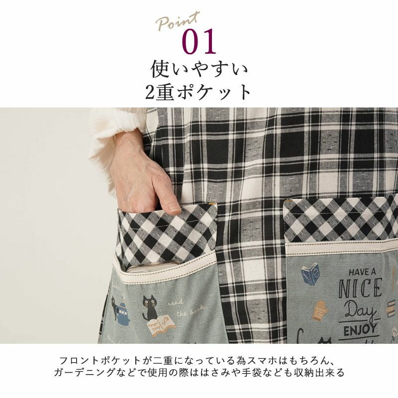 幅広2段ポケット 黒猫プリント チェック柄エプロン