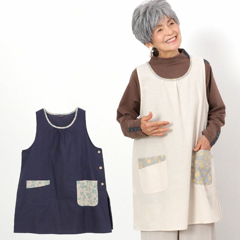 ナチュラル感のあるやさしいカラーの花柄プリントエプロン。それぞれの花柄切替やバックスタイルがおしゃれなので、エプロンとしてはもちろん、おうち着のチュニックとしても使えます。サイドボタンを3つ開けると、左脇がフリーになり、脱ぎ着しやすくなります。