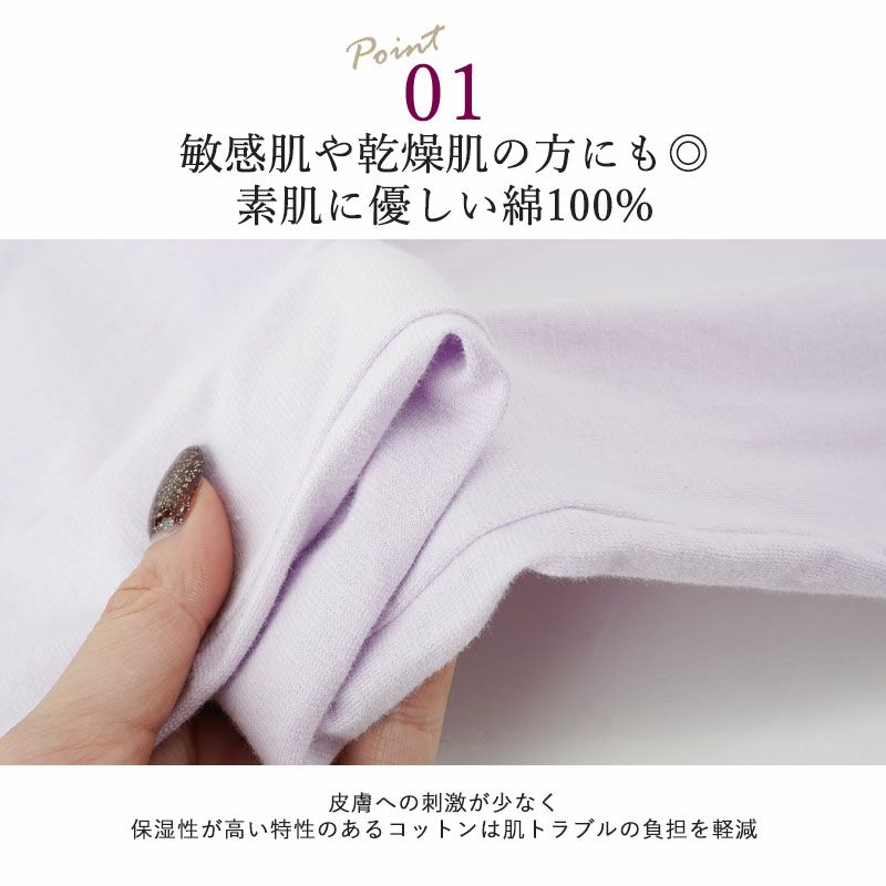 ●皮膚への刺激が少なく保湿性が高い特性のあるコットンは敏感肌の方や乾燥が気になる方にも快適に過ごせて肌への負担も少ない
