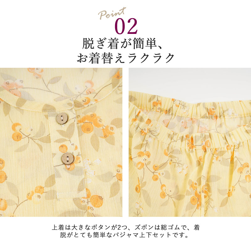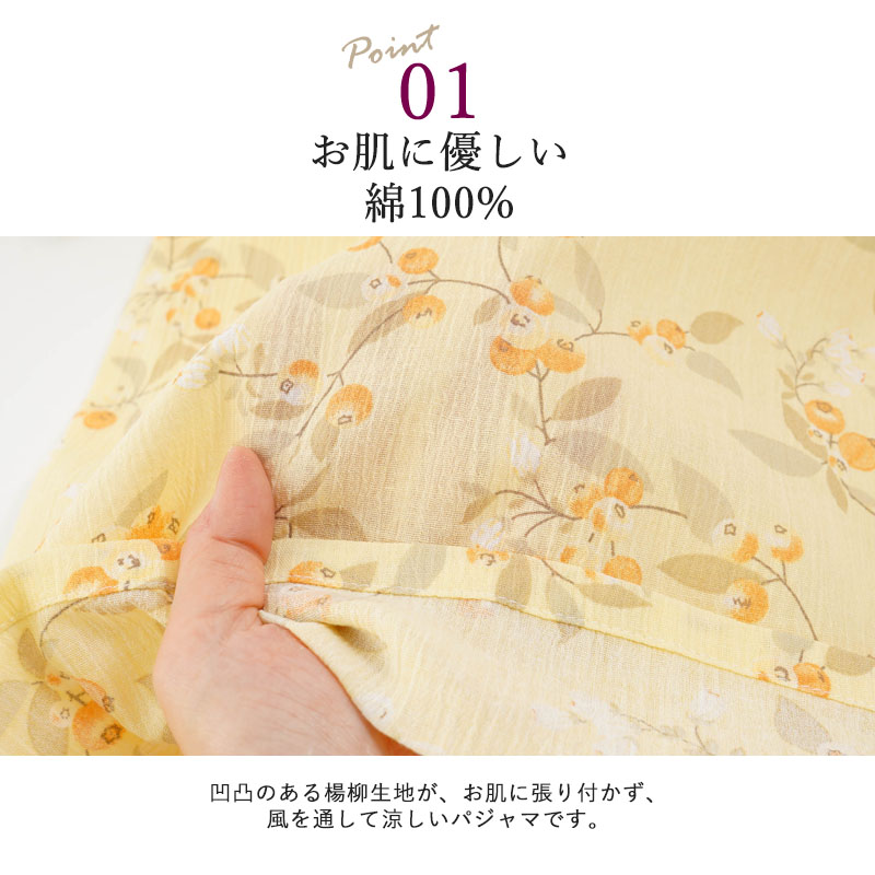 綿100%で汗をかきやすい季節も安心。ポコポコとした凹凸が特徴の楊柳生地は、肌に触れる面積が少なく、ベタつかずサラッとした肌触り。お洗濯を繰り返しても柔らかさが持続します。