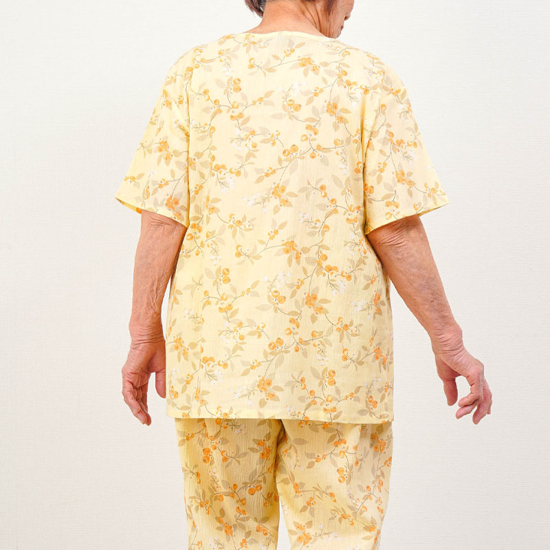 上着は前ボタンが2つだけで、手先が不自由な方でも着脱がスムーズ。ズボンは総ゴム仕様で、お腹を締め付けず快適です。ゆったりとしたシルエットで、寝返りも打ちやすく、一日中リラックスできます。