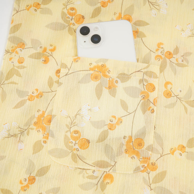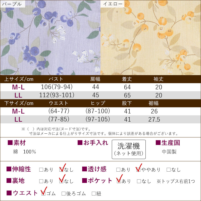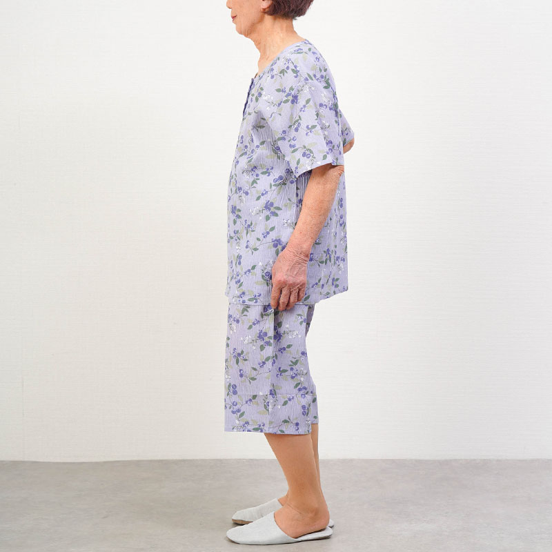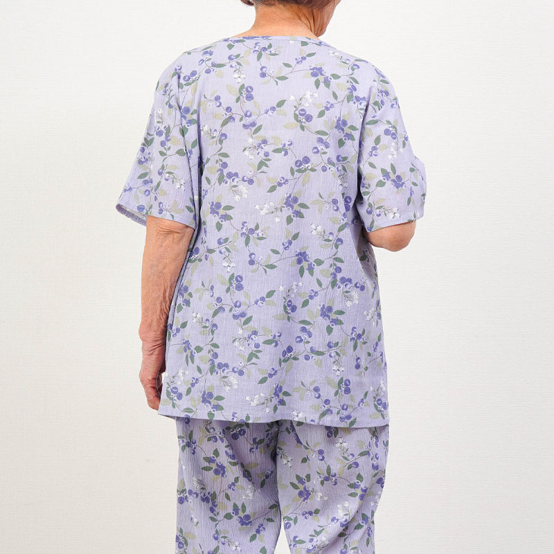 落ち着いた色合いのブルーベリーと小花が描かれた上品なデザイン。お顔周りをパッと明るく見せてくれます。介護施設での室内着や入居準備、母の日や敬老の日、お誕生日などの贈り物にも最適です。