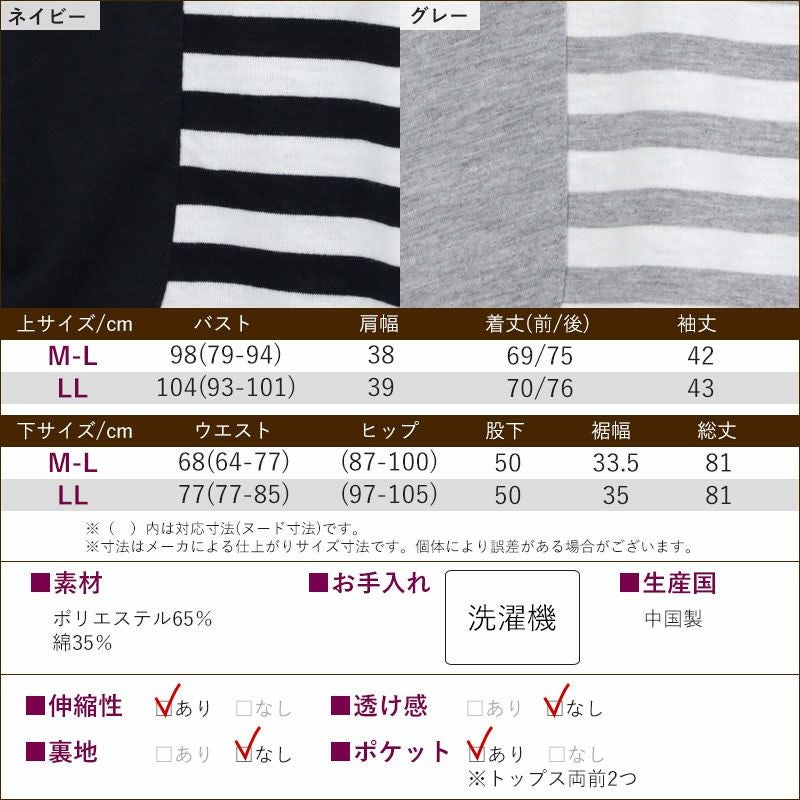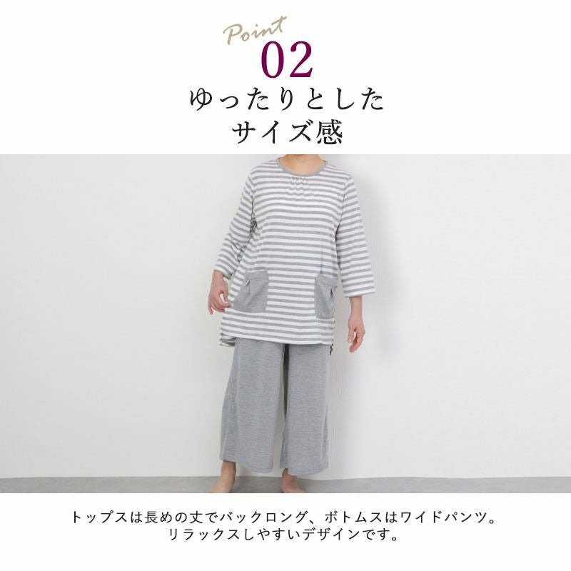リラックスタイムもオシャレで若々しく過ごせそうな、ボーダー柄の上下ルームウェア。トップスは長めの丈でバックロング、ボトムスはワイドパンツでゆったりとしたサイズ感で、おうち時間もリラックス出来ます。ちょっとした時に便利なポケット付きです。