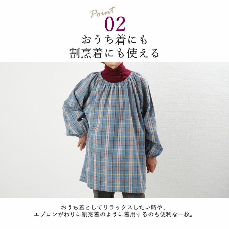 柔らかで暖かみのある起毛チェックのチュニックブラウス。たっぷりの身幅と襟ぐりにゴムギャザーを入れ、ラグラン袖にすることで着やすく、ゆったり楽々の着心地です。ネルのような生地感で、袖口のゴムが付いているので腕まくりしやすく毎日の家事にも便利に使えますし、おうち着のチュニックとしても使えます。