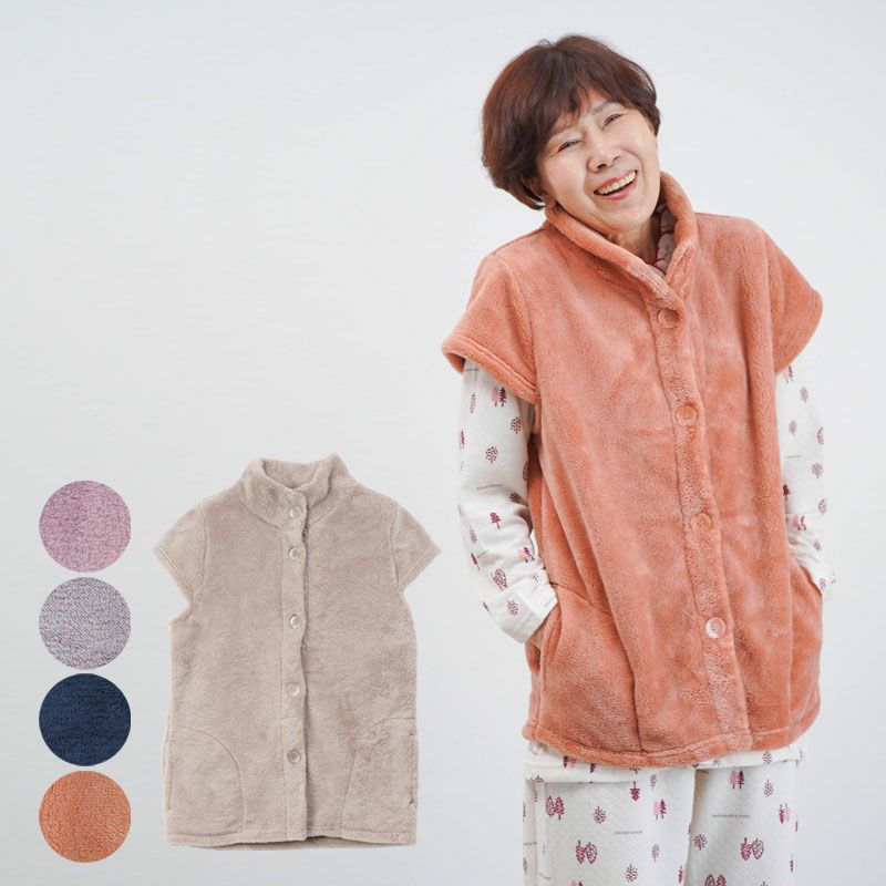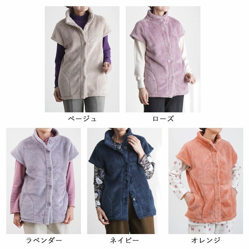 ●ふわもこの暖かさ:ふわふわの毛足の長いフリースを全面に使用し、軽くて暖かいベストです。半袖タイプで寒さを感じやすい肩まわりまでしっかりと暖かく包み込みます。