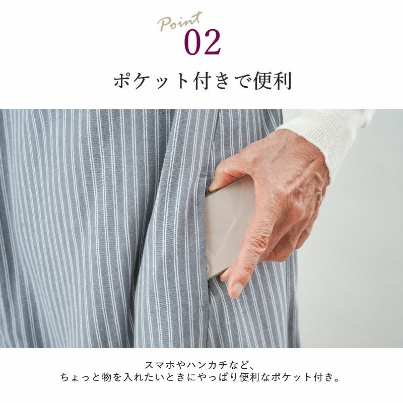 ほんの少し起毛した素材で、春先まで使えるシックなカラーのストライプ柄。両前には便利なポケット付きです。
