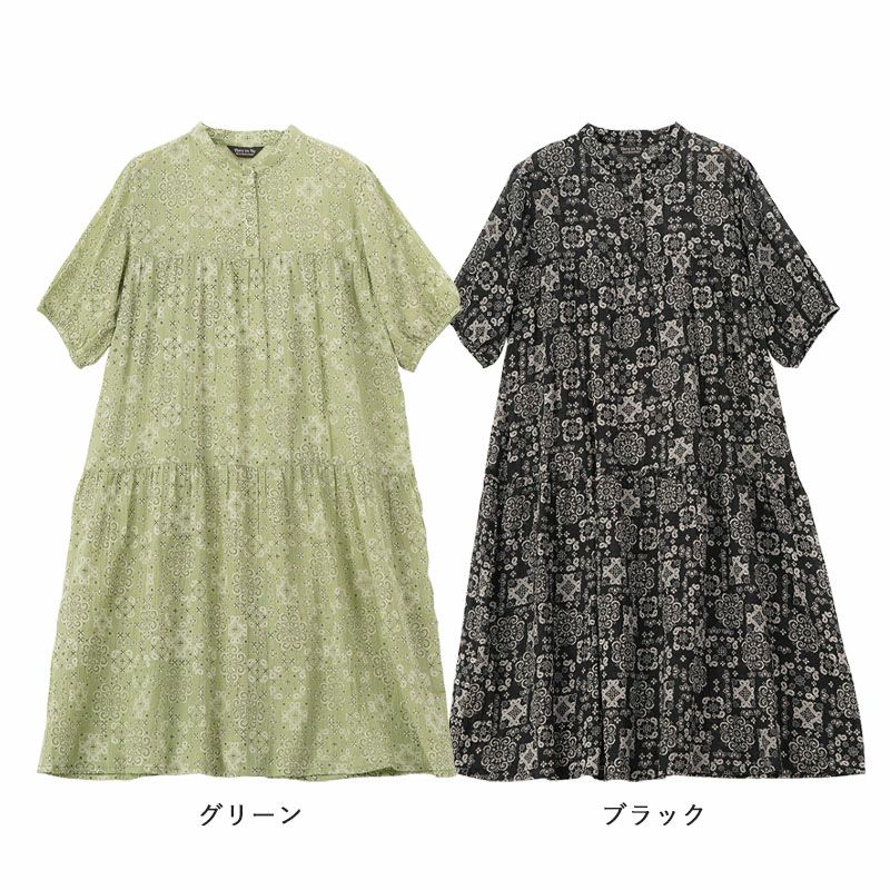 バンダナ柄 綿ボイルプリント ティアードワンピース