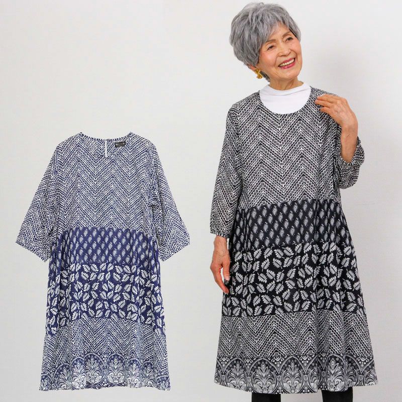 涼やかで肌触りの良い薄手のインド綿に、エスニックプリントがリゾート感溢れる七分袖ワンピース。Aラインでたっぷりとした身幅のふんわりシルエットが魅力です。