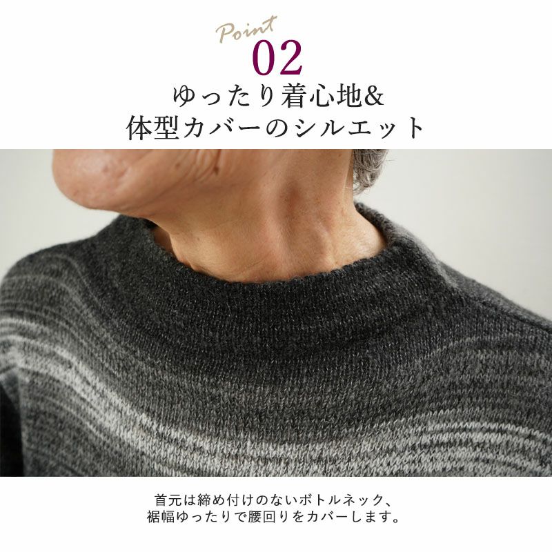 かすり糸が醸し出す美しいグラデーションボーダーの上品なチュニックセーター。首元は暖かく、締め付けのないボトルネックで着心地抜群です。腰まわりの体型カバーも出来るゆったりシルエット。