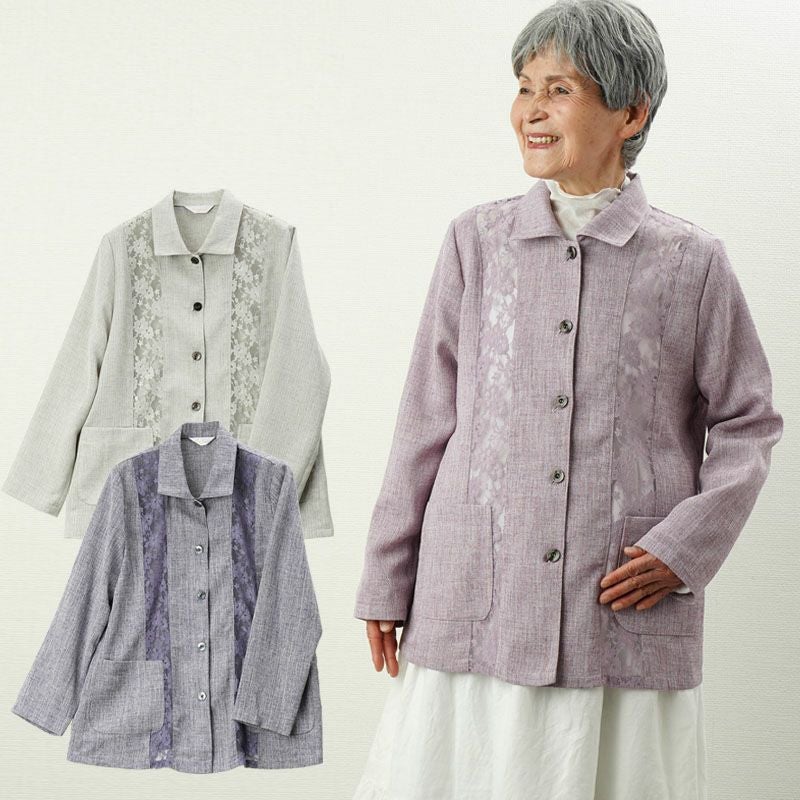 麻調素材 レース切替 春ジャケット