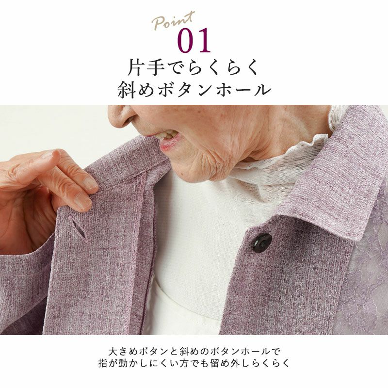 ●斜めのボタンホールと大きめボタンは片手でも楽に留め外しが出来る仕様