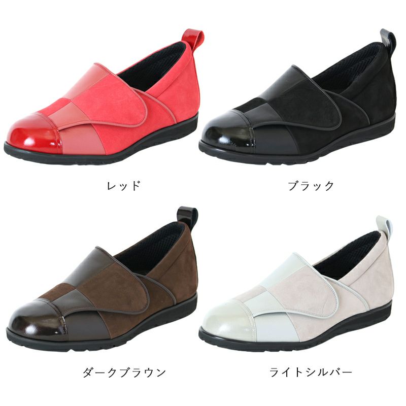エナメル、スムース、ヌバックと3種類の革素材を使用した、パッチワークデザインが可愛らしい幅広5Eシューズ。