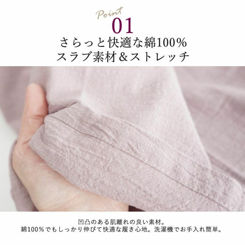 ● 綿100%のスラブ素材でさらっと快適パンツ:太さにムラのある糸を使った風合い豊かな生地。凹凸があり肌に貼りつきにくく、春夏にぴったり。