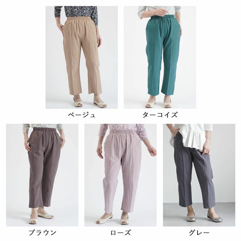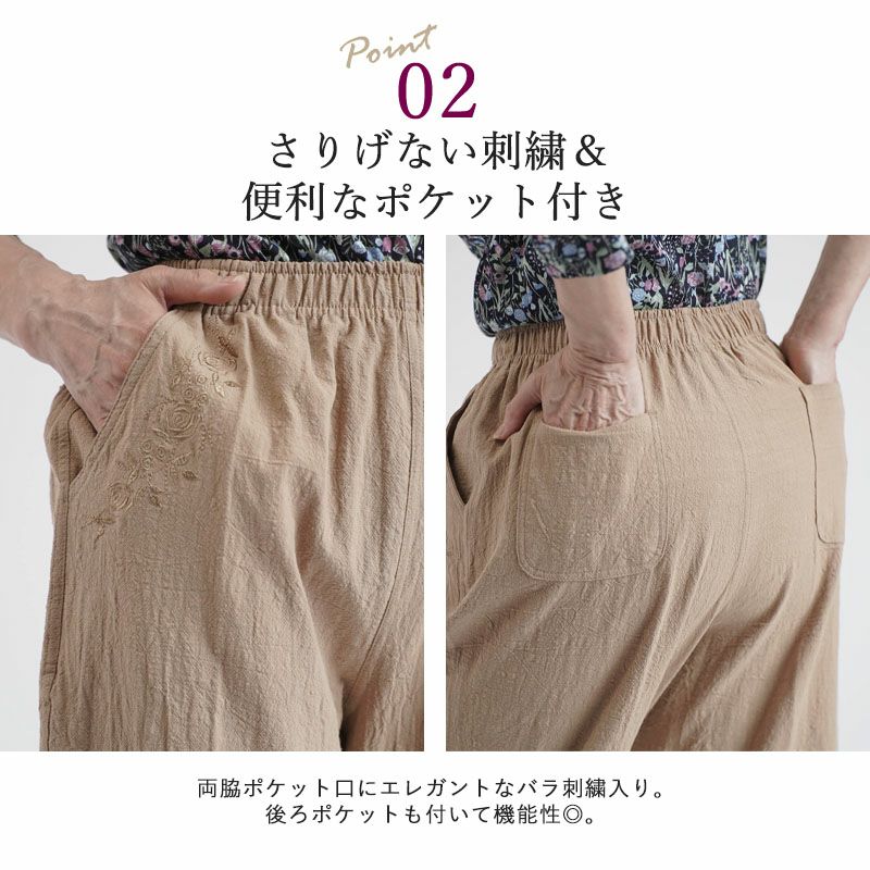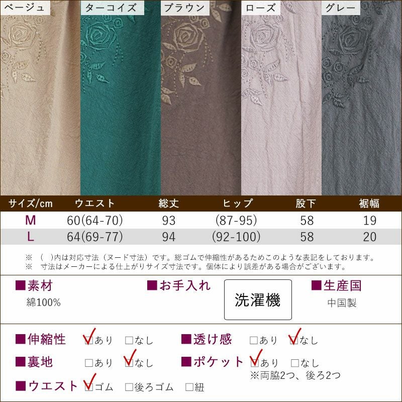 綿100% バラ刺繍 カジュアルストレッチパンツ 股下58cm