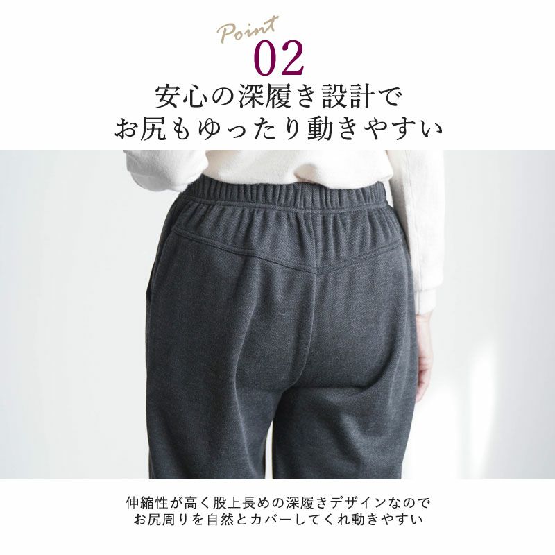 ●快適な履き心地:ストレッチ性が抜群で、楽に履けるストレートシルエット。股上が深めの設計で、お尻周りがゆったりとしており、動きやすさも抜群です。