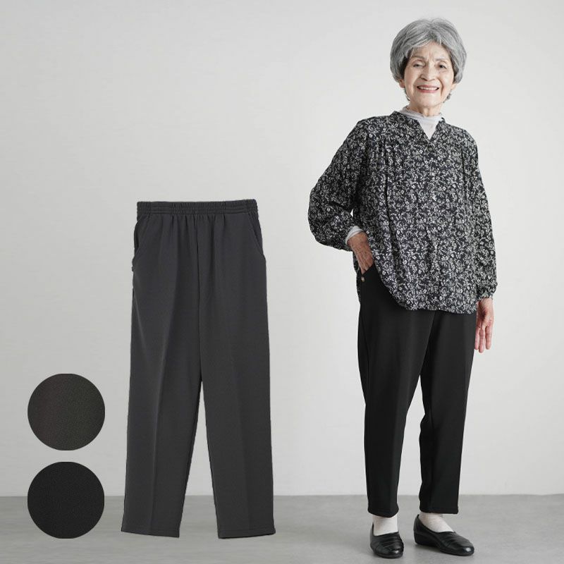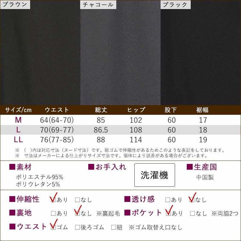 ●上品なちりめん素材と裏起毛:表側は上品なちりめん素材、裏側はふんわりやわらかな裏起毛で、履いた瞬間から暖かさを実感できます。秋冬の装いにぴったりのパンツです。
