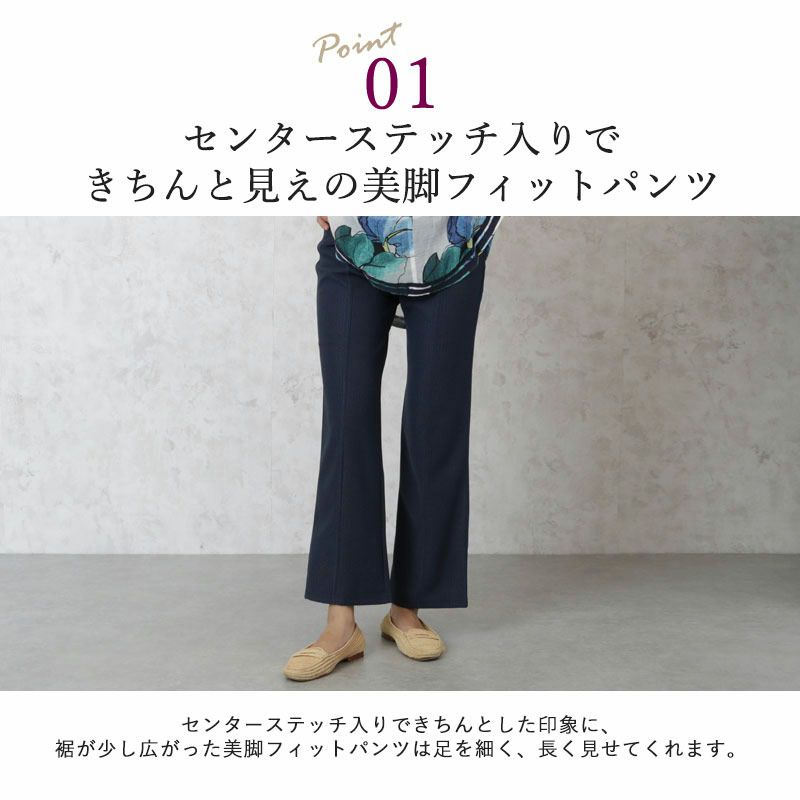 通気性がよくさらりとした手触りの裏メッシュ素材を使用した、センターステッチ入りできちんと見えの美脚フィットパンツ。