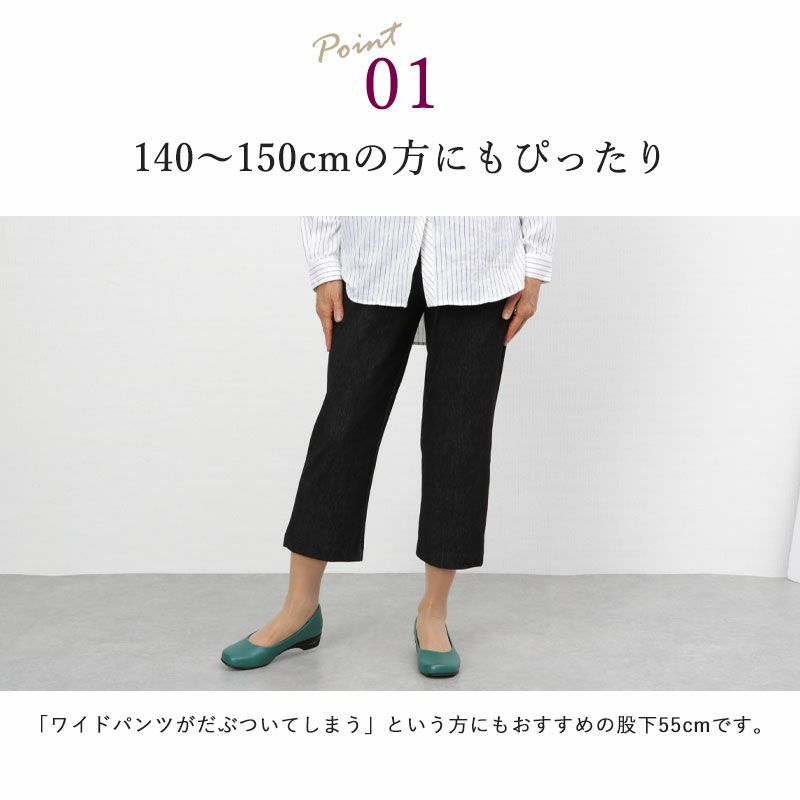 ワイドパンツがだぶついてしまうという、背が140~150cmの方にもおすすめの股下55cmです。