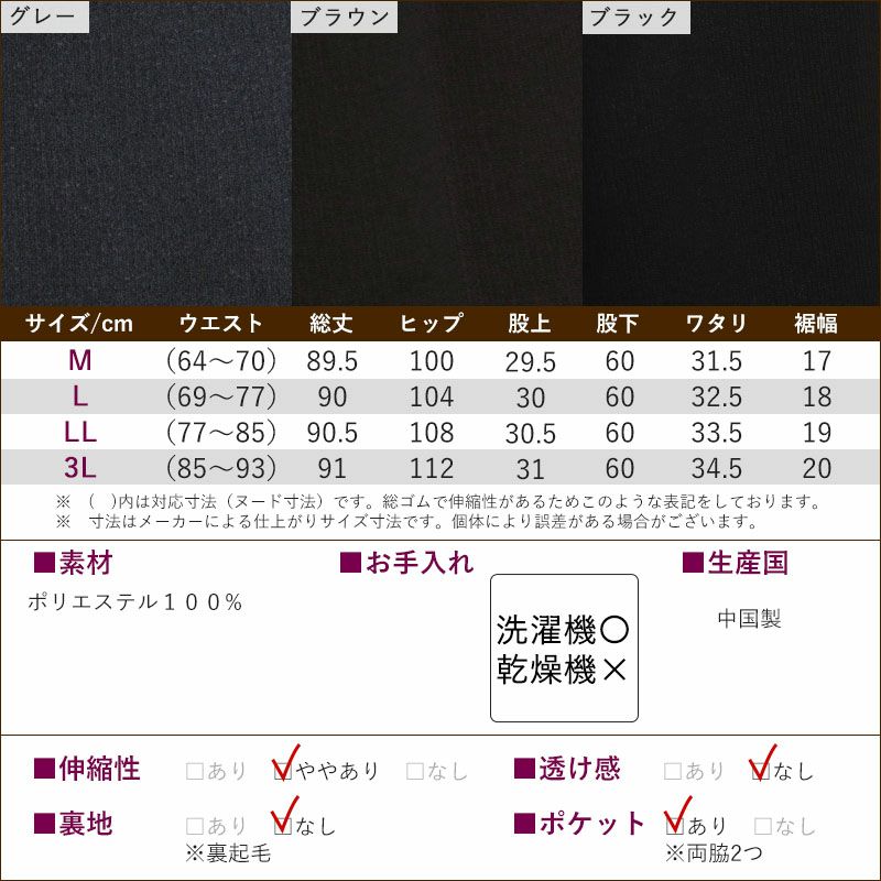 太ももまわりがゆったり、深履きのスラックスタイプで、表は伸縮性の少ないしっかりした素材を使用しているので、昔ながらの安心の履き心地です。