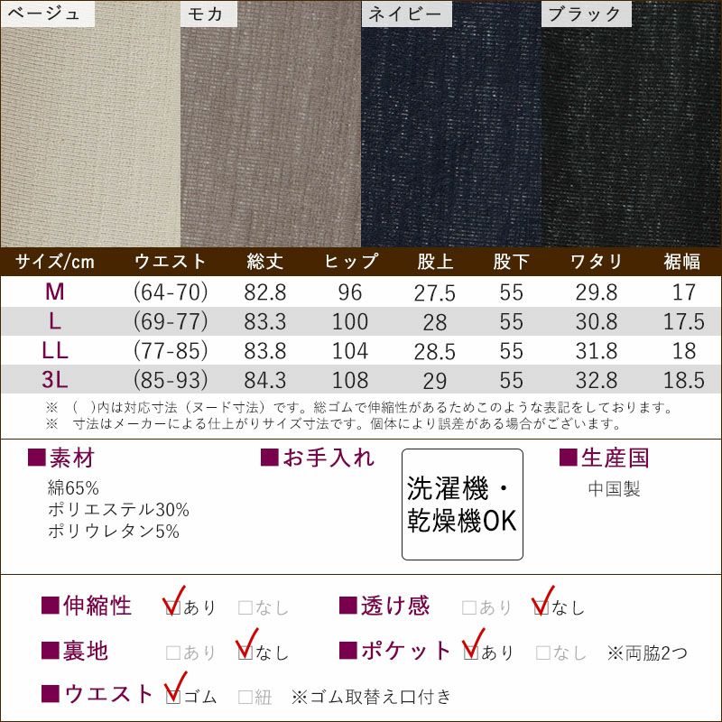 乾燥機対応 夏向き やわらか綿スラブ ストレッチ パンツ 股下55cm