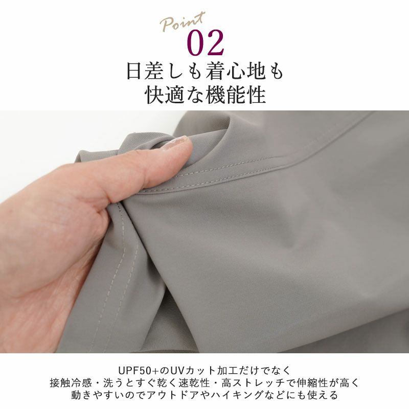 ●全方向ストレッチとUPF50+のUVカット加工で、動きやすく紫外線からも保護。高い機能性で外出時も快適です。