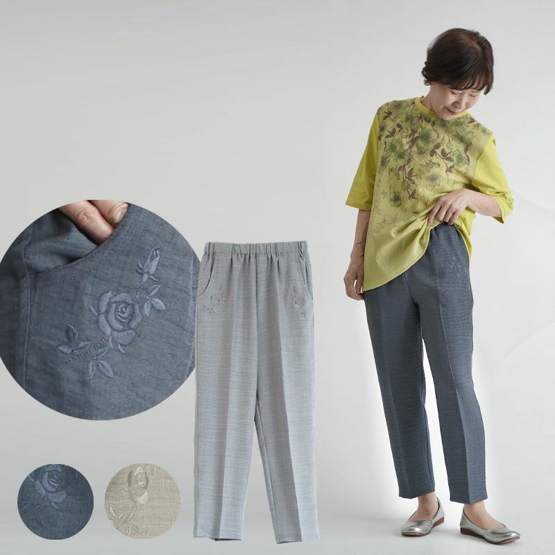 乾燥機対応 杢ツイル バラ刺繍 スラックスパンツ 股下60cm