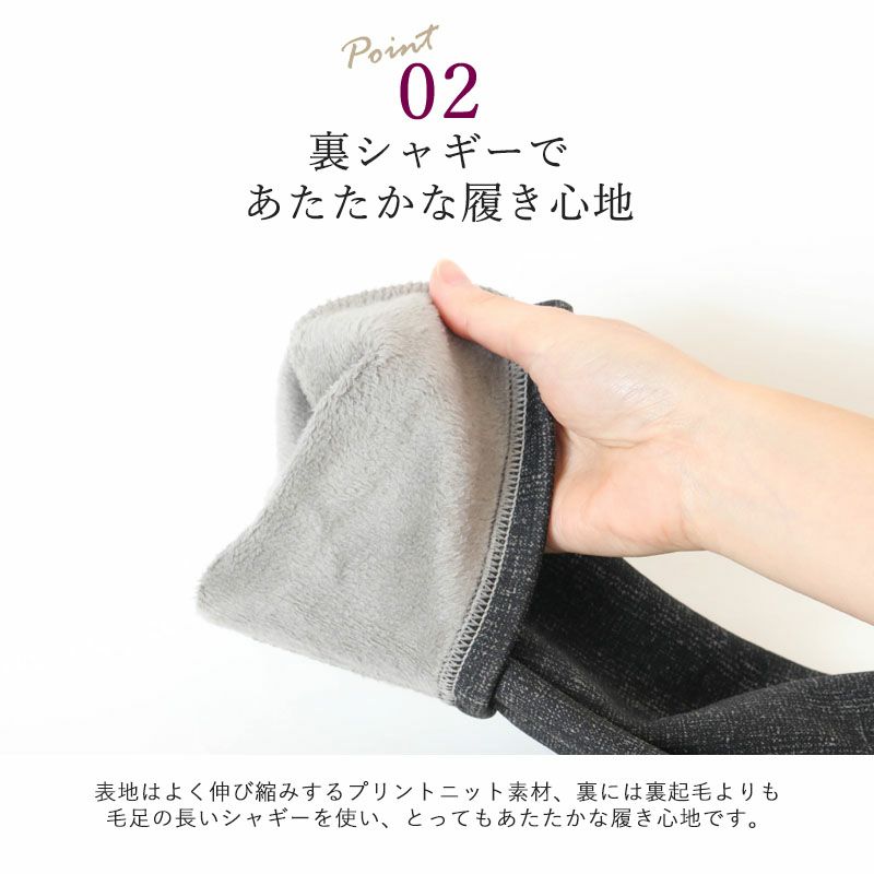 表地はよく伸び縮みするプリントニット素材、裏には裏起毛よりも毛足の長いシャギーを使い、とってもあたたかな履き心地です。