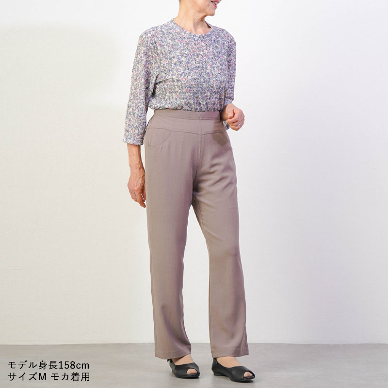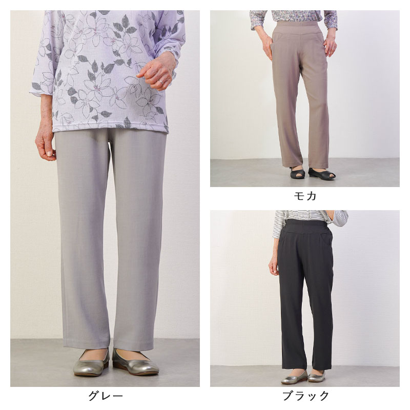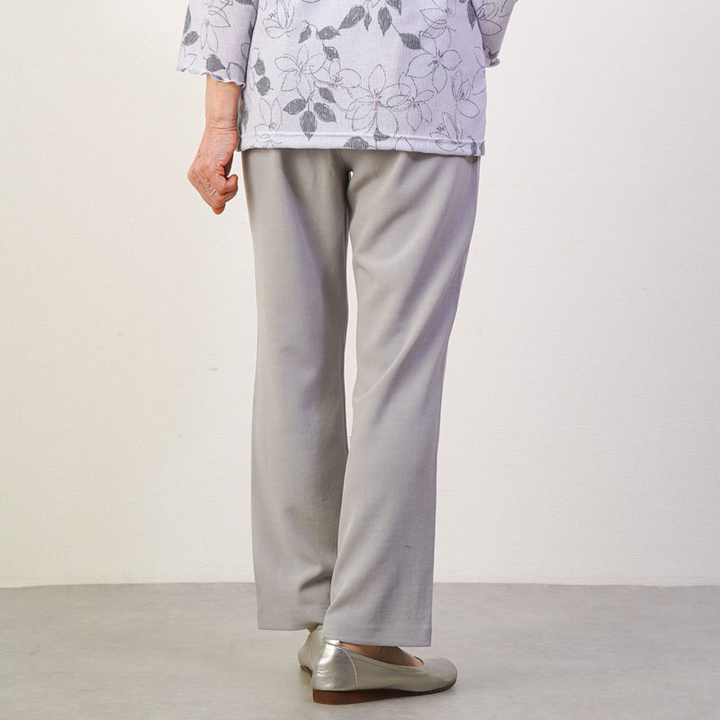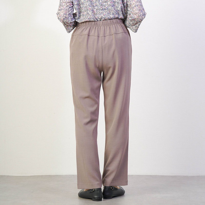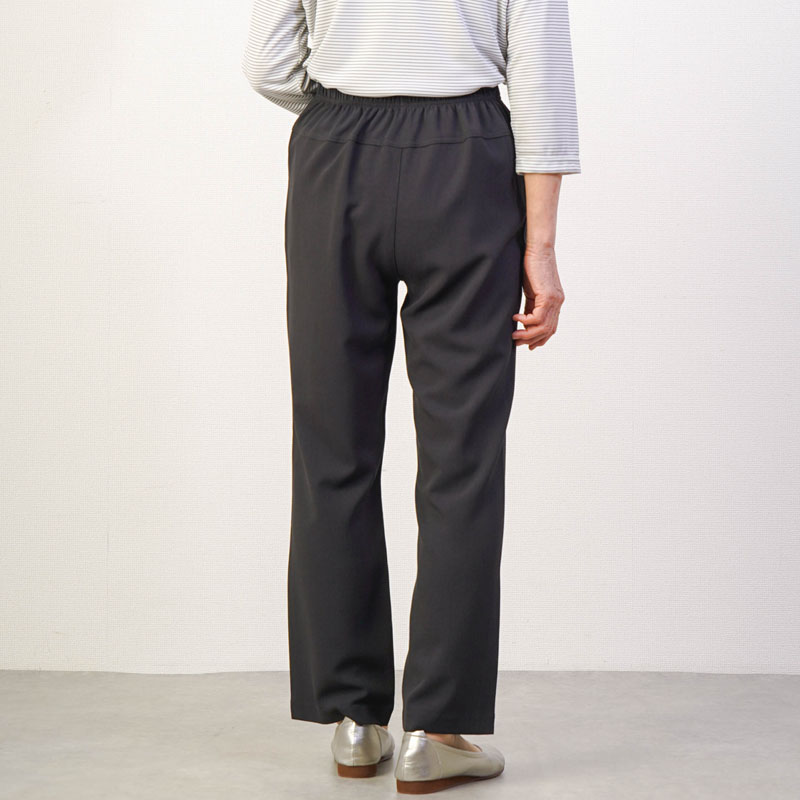 しなやかで上品な光沢感のあるTR素材を使用した、見た目にも美しいストレートパンツです。お出かけ時も「きちんとした印象」を与えつつ、さらりとした肌触りで、汗ばむ季節もベタつかず快適に過ごせます。
