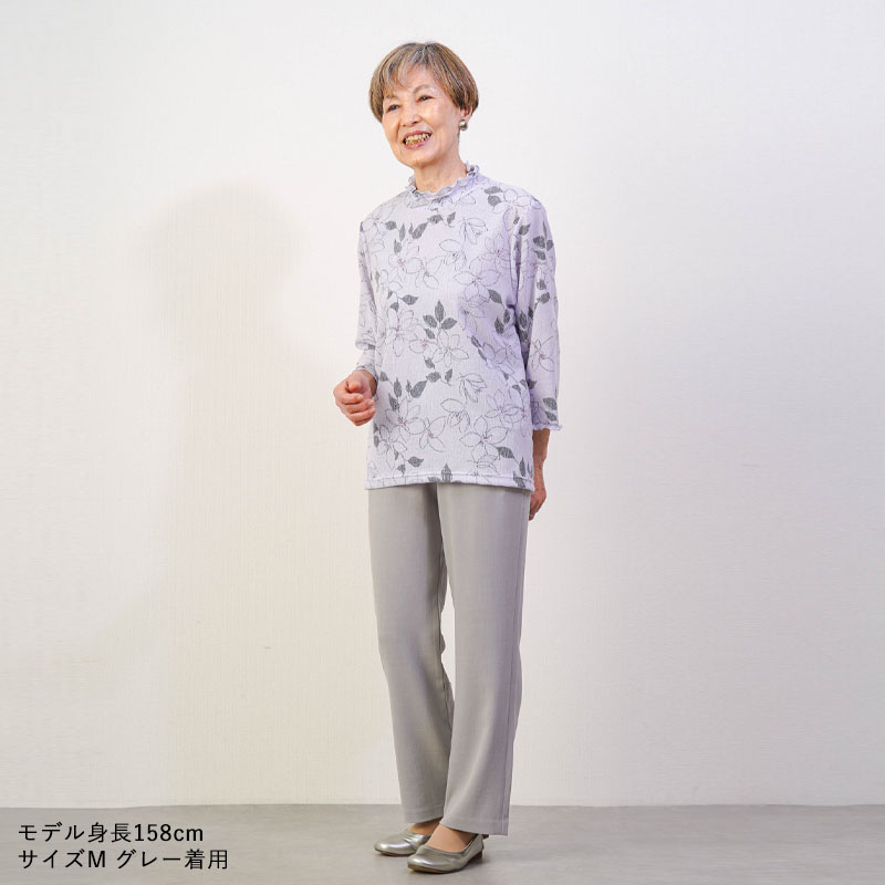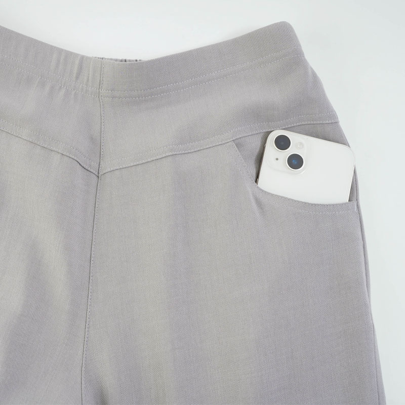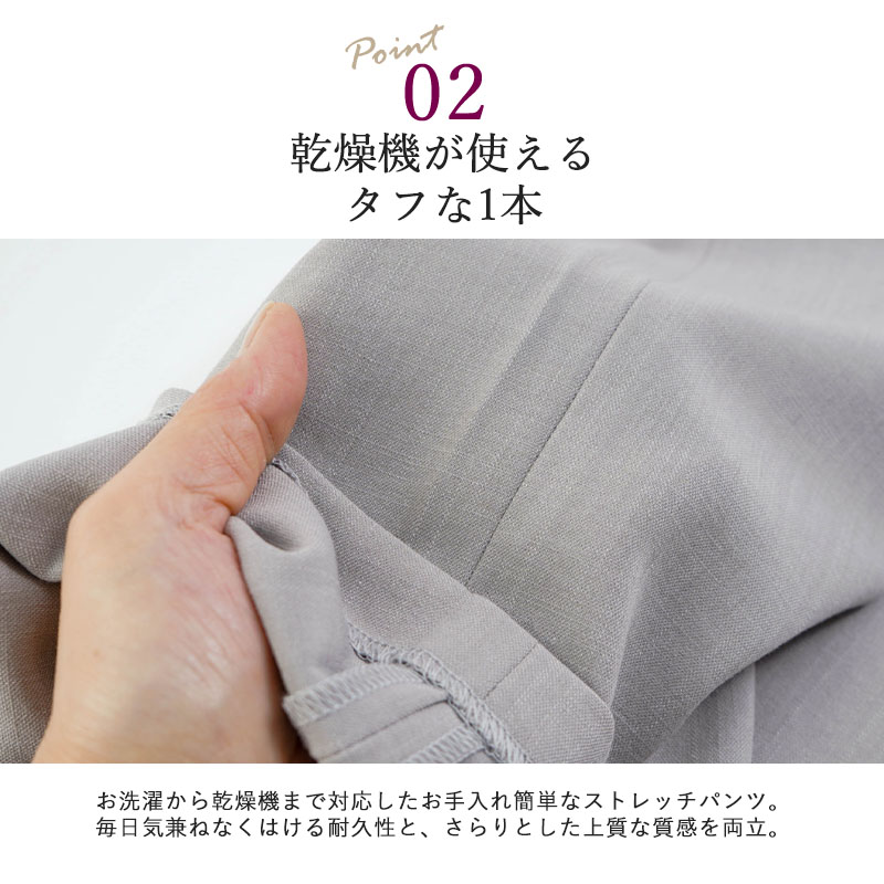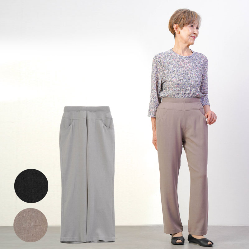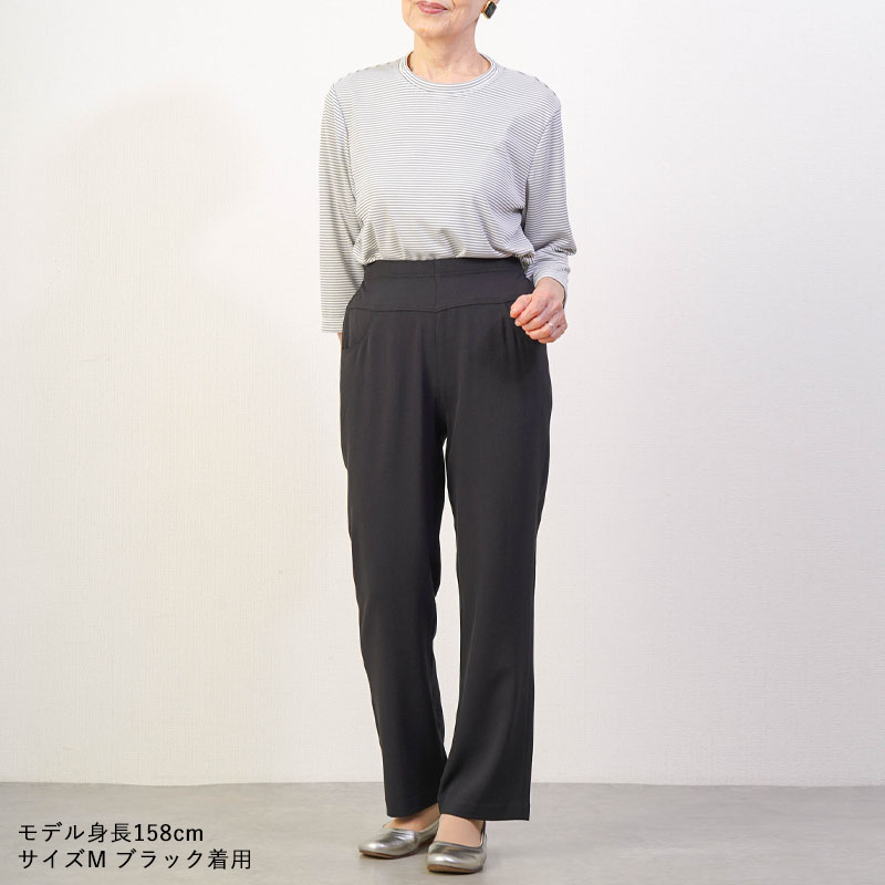 しなやかで上品な光沢感のあるTR素材を使用した、見た目にも美しいストレートパンツです。お出かけ時も「きちんとした印象」を与えつつ、さらりとした肌触りで、汗ばむ季節もベタつかず快適に過ごせます。