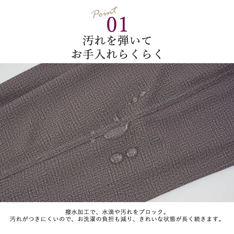 生地の表面に撥水加工を施しているため、飲みこぼしや泥跳ねなどの汚れがつきにくいのが最大の特徴です。サッと拭き取れるので、毎日の家事やお食事、デイサービスへのお出かけも、汚れを気にせず笑顔で過ごせます。