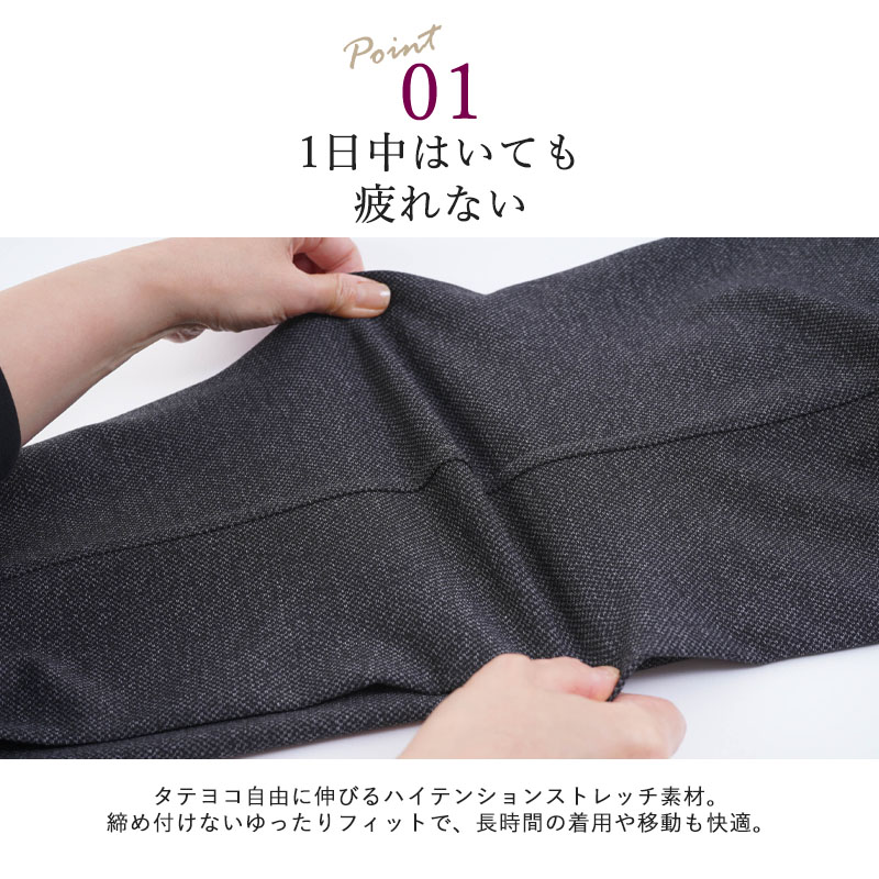タテ・ヨコ・ナナメ全方向に驚くほど伸びるハイテンション素材を使用。締め付け感がなく、座ったり立ったりもスムーズです。お家でのリラックスタイムから、ちょっとしたお出かけまで幅広く活躍する快適パンツです。