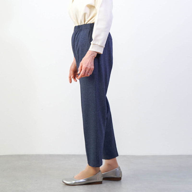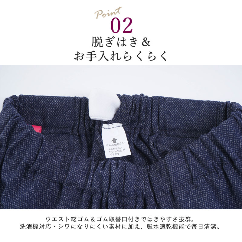 ウエストは全面やわらかいゴム仕様。お腹周りを優しく包み込み、ずり落ちにくいのに、脱ぎはきはとってもカンタンです。さらに、ゴムの入れ替え口付きなので、体型に合わせて調整でき、長く愛用いただけます。