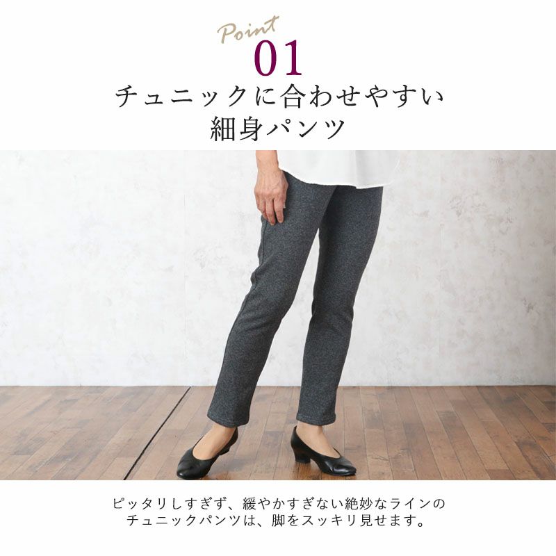 レギンスほどピッタリしすぎず、緩やかすぎない絶妙なラインのチュニックパンツは、脚をスッキリ見せます。