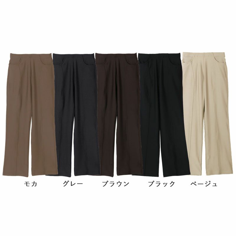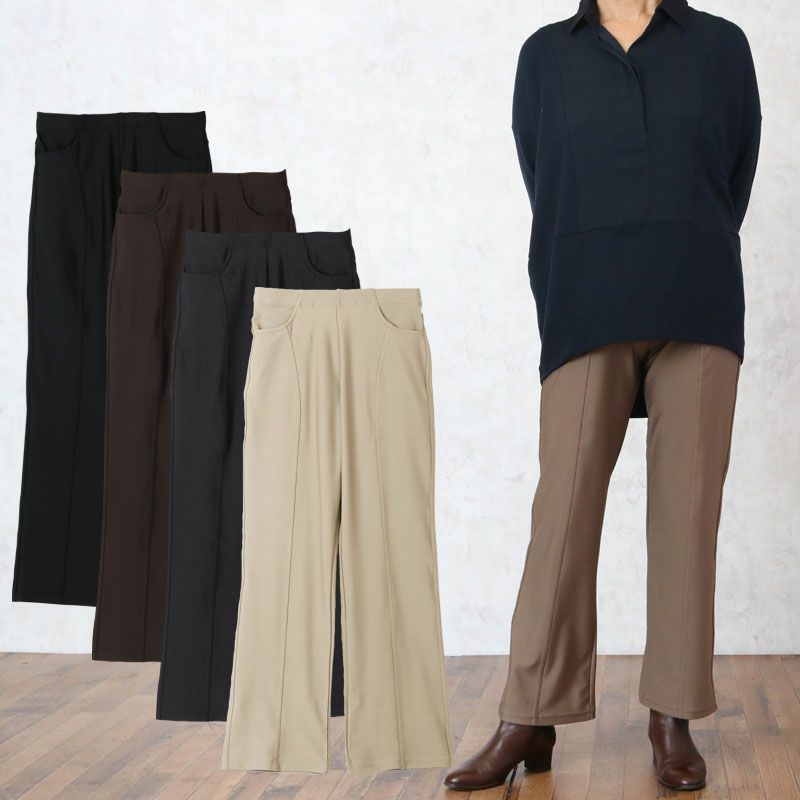 センターステッチ入りできちんとした印象に、裾が少し広がった美脚カットパンツは足を細く、長く見せてくれます。