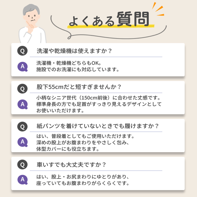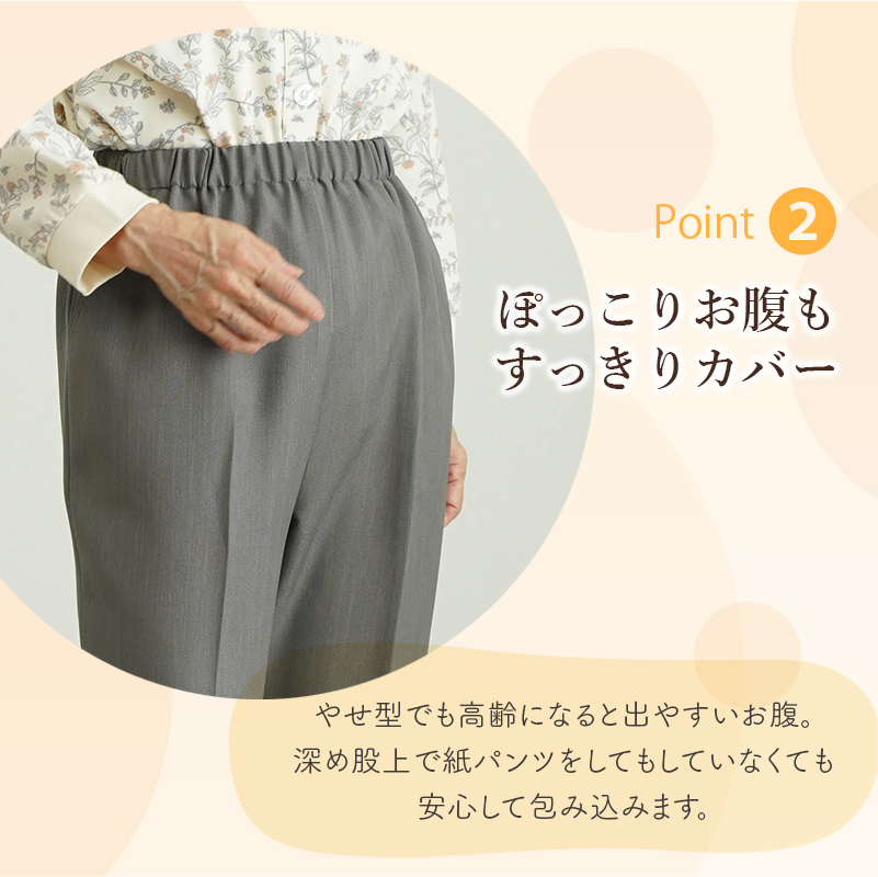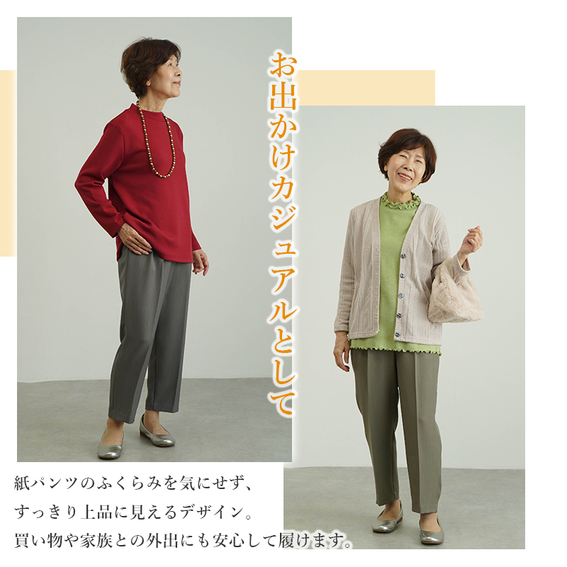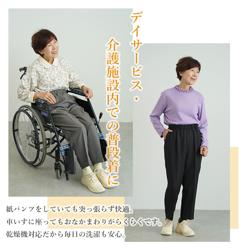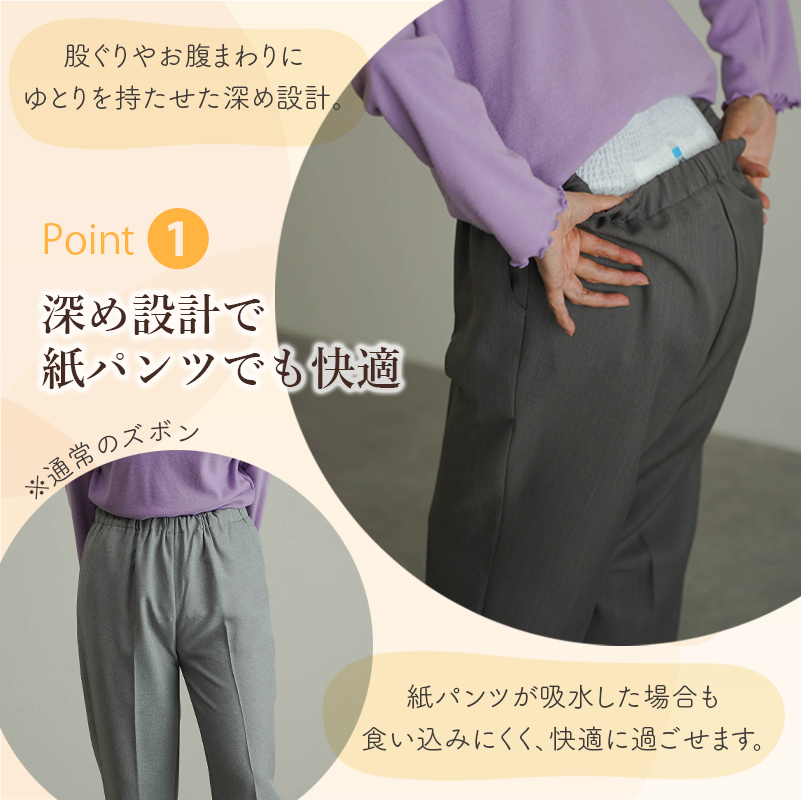 ●深め設計で股ぐりやお腹まわりにゆとりを持たせた、紙パンツ対応レディースパンツです。おむつを着けても突っ張らず、安心して動けます。