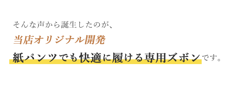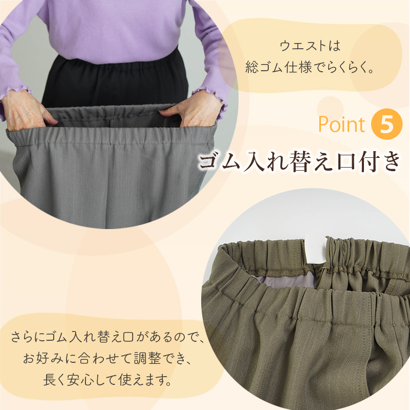●ウエストは総ゴム仕様。さらにゴム入れ替え口付きで、お好みに合わせたサイズ調整が可能。長く快適にお使いいただけます。