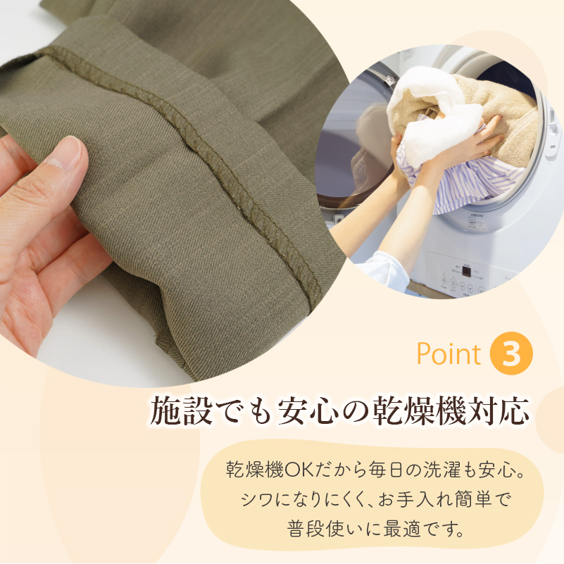 ●乾燥機対応だから介護施設生活でも安心。毎日の洗濯で型崩れしにくく、お手入れが簡単です。