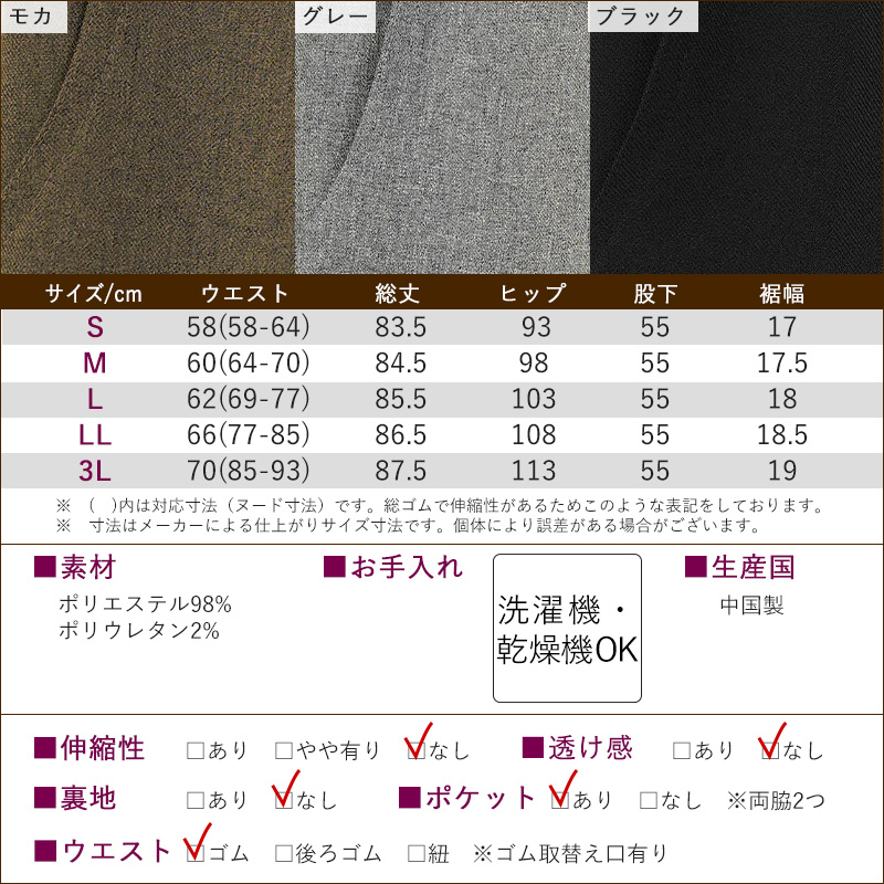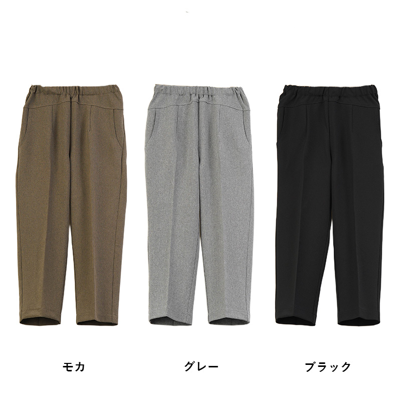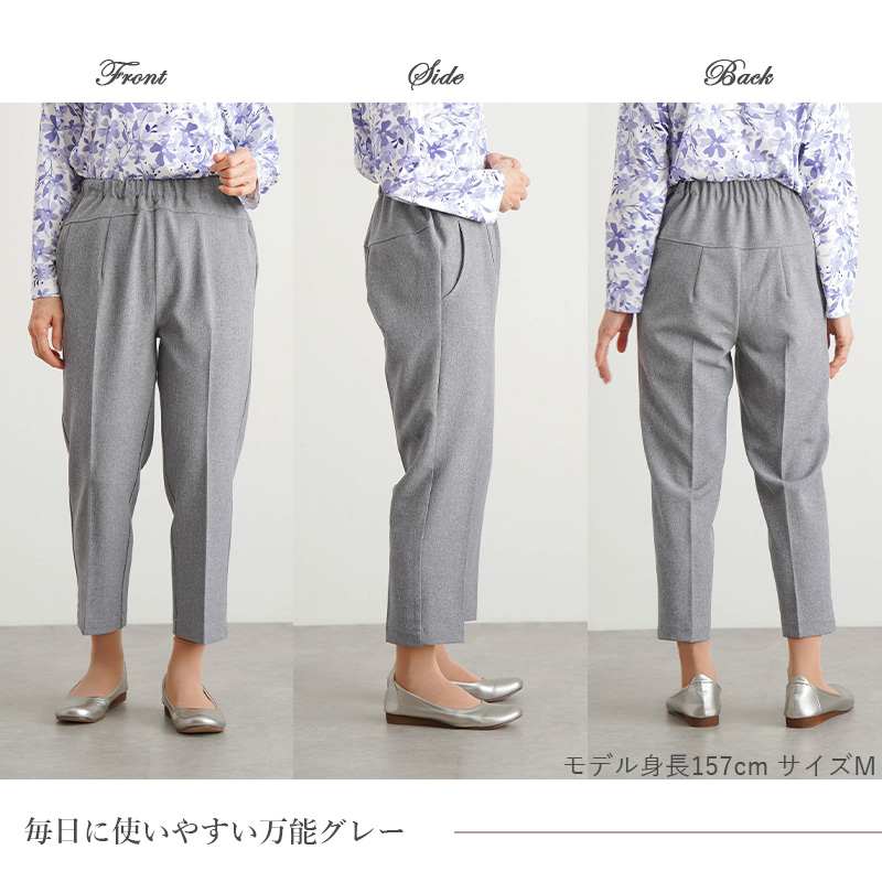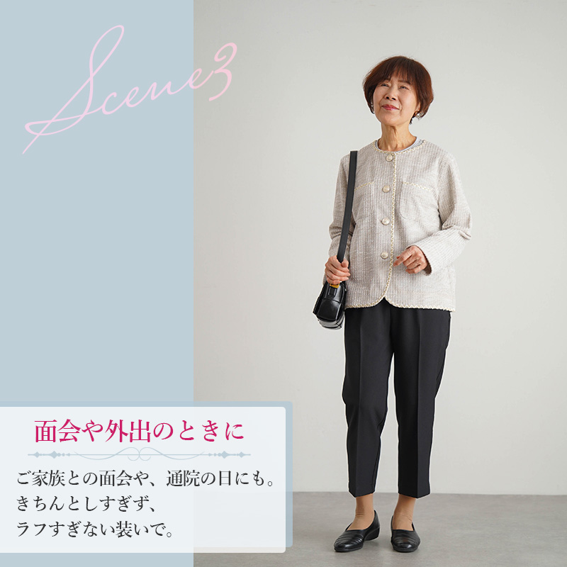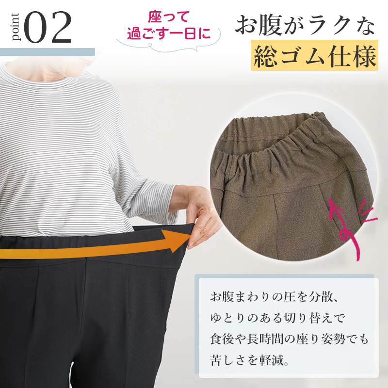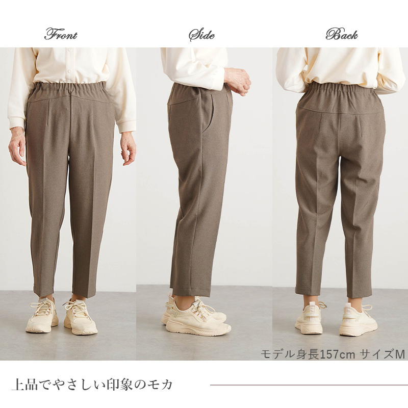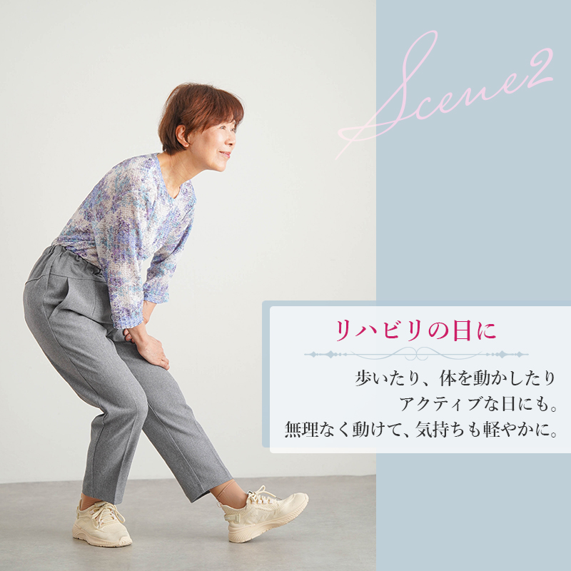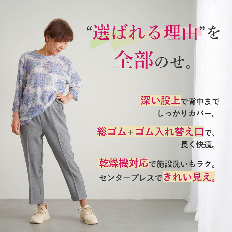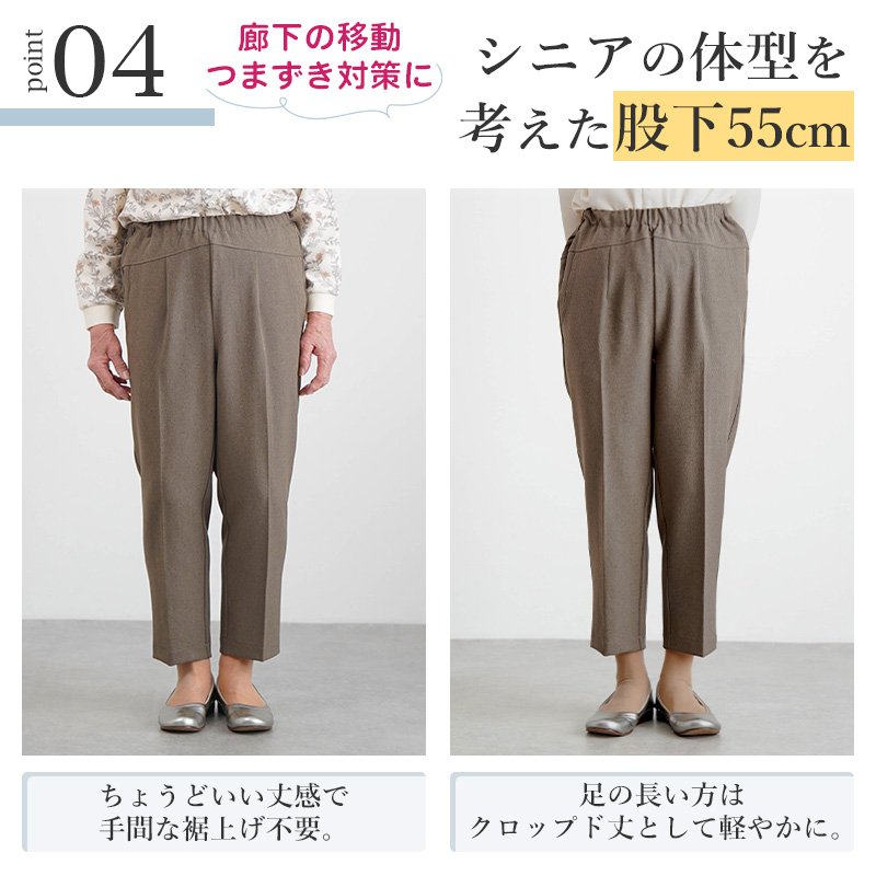 ●シニア向け短め丈の股下55cmで、裾がもたつきにくくつまずき対策にも。小柄な方はそのままきれいに、足の長い方はクロップドパンツのように軽やかに着用できます。