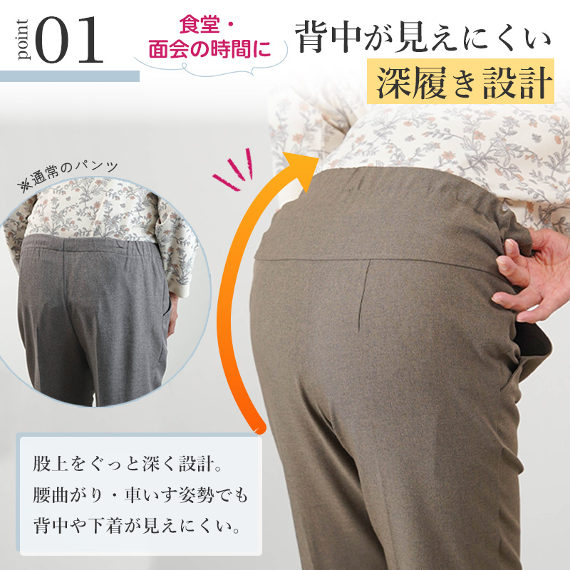 ●股上深めの深ばき設計で、お腹まわりを締めつけにくく、前かがみでも背中・下着が見えにくいのが特長。腰が曲がった方/高齢者/長時間座る方も快適に着用できます。