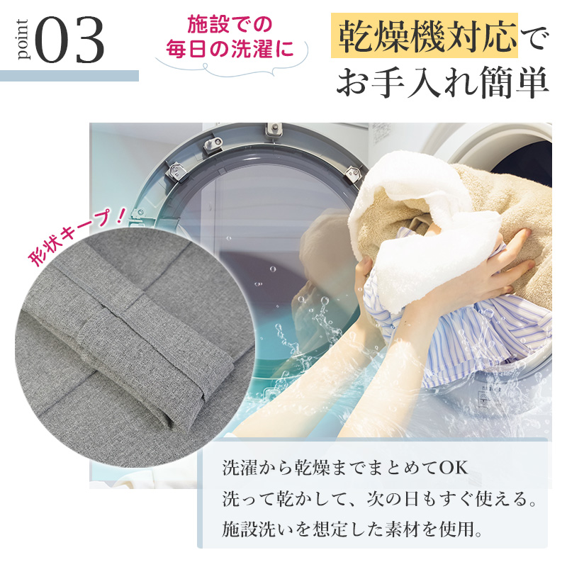 ●洗濯機OK・乾燥機対応でお手入れ簡単。介護施設・病院・老人ホームなど、洗濯回数が多い環境でも使いやすく、型崩れしにくいのも嬉しいポイントです。